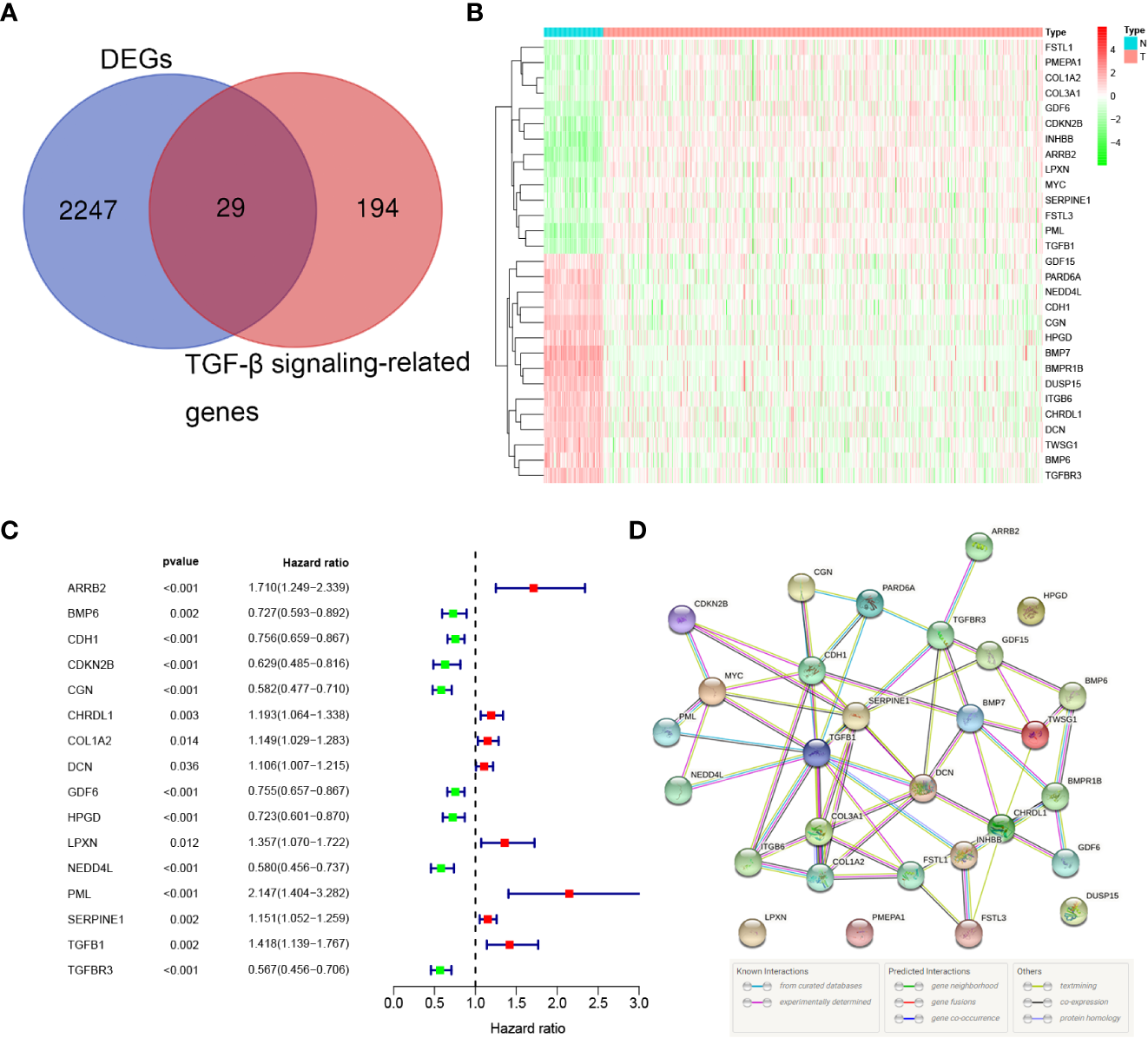 Identification of the prognostic TGF-β signaling-related genes in the TCGA cohort. (A) Venn diagram to identify DEGs between normal and tumor tissue. (B) The 29 overlapping genes were differently expressed in normal and tumor tissue. (C) Forest plots showing the significantly prognostic genes identified with univariate Cox regression analysis based on OS. (D) The PPI network downloaded from the STRING database indicated the interactions among candidate genes.