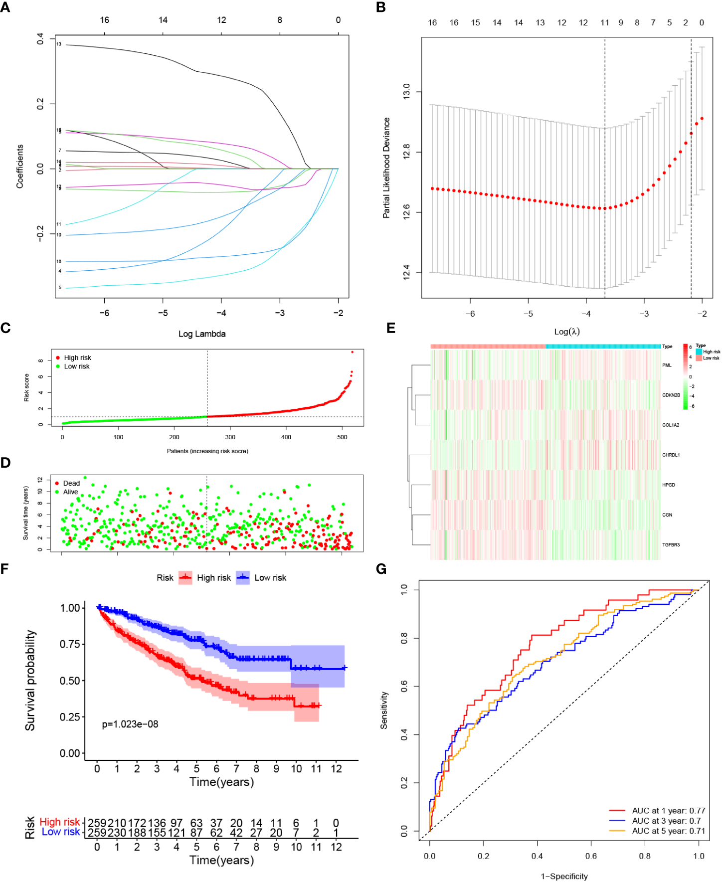 LASSO Cox regression analysis was conducted to filter out the key genes (Figures 3A, B). Then, the multivariate Cox regression method was performed to further screen candidate genes. Finally, 7 genes, PML, CDKN2B, COL1A2, CHRDL1, HPGD, CGN and TGFBR3, were identified as prognostic signature genes. The risk score was measured as follows: risk score = (0.417 × the expression level of PML) + (-0.373 × the expression level of CDKN2B) + (0.109 × the expression level of COL1A2) + (0.104 × the expression level of CHRDL1) + (-0.195 × the expression level of HPGD) + (-0.399 × the expression level of CGN) + (-0.340 × the expression level of TGFBR3). According to the median cut-off value, patients were classified into low risk and high risk groups (Figure 3C). Compared with the low risk group, a significantly higher mortality rate were observed in the high risk group (Figure 3D). The heatmap result indicated that patients with high risk exhibited high expression levels of PML, COL1A2, and CHRDL1 but low expression of CDKN2B, HPGD, CGN and TGFBR3 (Figure 3E). K-M curves suggested that compared with patients with low risk, patients with high risk had a worse OS (p < 0.001). (Figure 3F). Additionally, the area under the ROC curve (AUC) of the 7-gene signature reached 0.77 at 1 year, 0.7 at 3 years, and 0.71 at 5 years, indicating a favorable predictive efficacy of the prognostic model (Figure 3G).