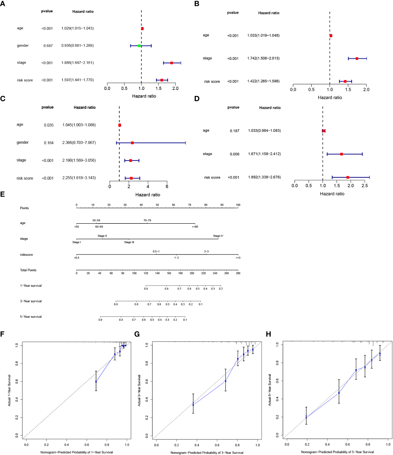 To clarify whether the signature could serve as an independent prognostic variable for OS, univariate and multivariate Cox regression analyses were performed. Univariate analysis shown that risk score was proven to be strong OS-related factors (TCGA cohort: HR = 1.597, 95% CI =1.441–1.770, p < 0.001, Figure 5A; E-MTAB-1980 cohort: HR = 2.255, 95% CI= 1.618–3.143, p < 0.001, Figure 5C). Multivariate analyses revealed that risk score was still a significantly prognostic variable for OS (TCGA cohort: HR = 1.422, 95% CI =1.265–1.598, p < 0.001, Figure 5B; E-MTAB-1980 cohort: HR = 1.892, 95% CI= 1.338–2.676, p < 0.001, Figure 5D). Therefore, risk score was confirmed as an independent prognostic factor for OS of ccRCC patients. The independent prognostic factors, namely age, stage and risk score, were utilized to construct a nomogram (Figure 5E). The calibration curve revealed that the nomogram presented better predictive performances at 1, 3, and 5 years of survival. (Figures 5F–H).