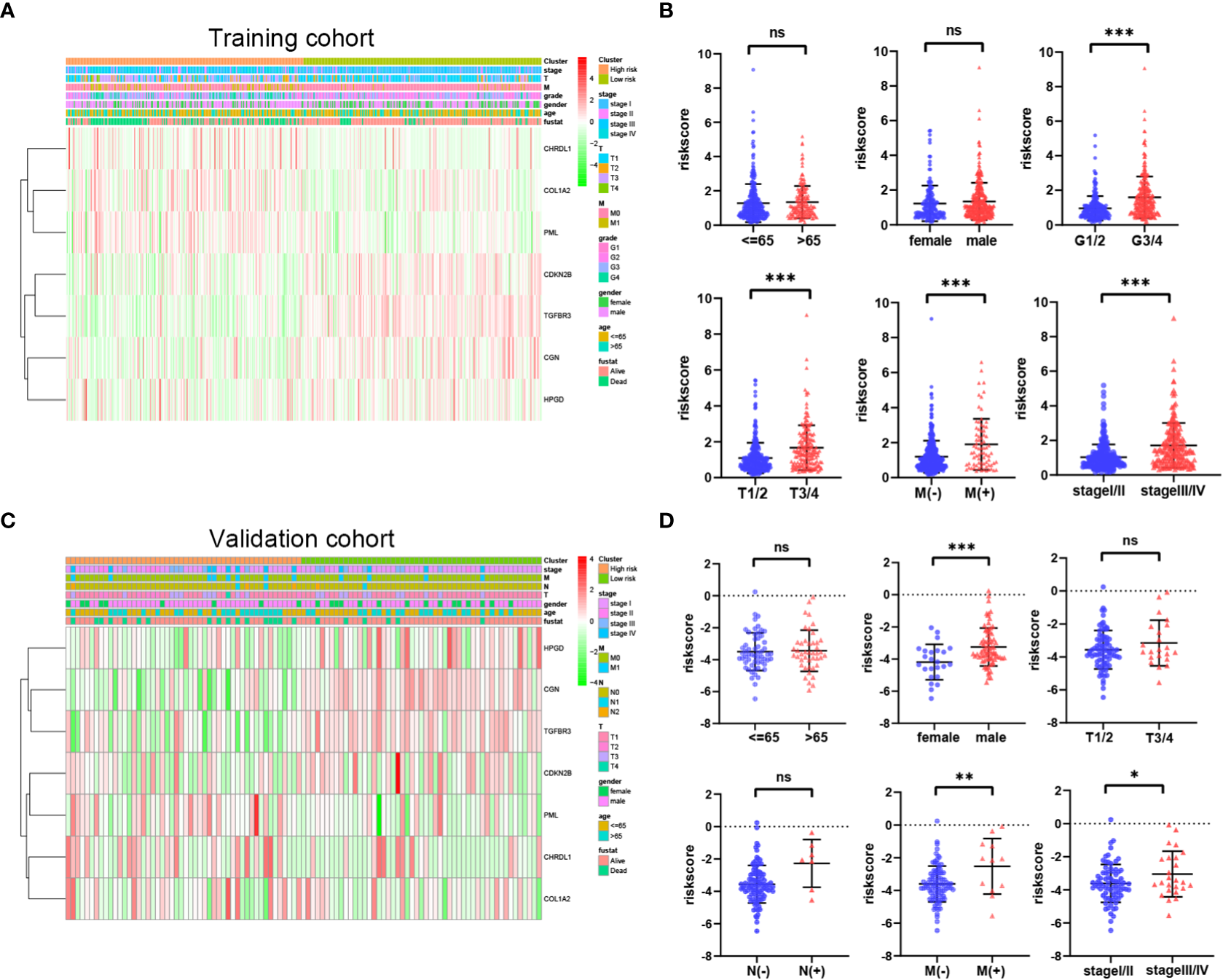 Relationship between riskscore and clinicopathological parameters in the TCGA cohort (A, B) and E-MTAB-1980 cohort (C, D). P values were shown as: ns, not significant; *P< 0.05; **P< 0.01; ***P< 0.001.