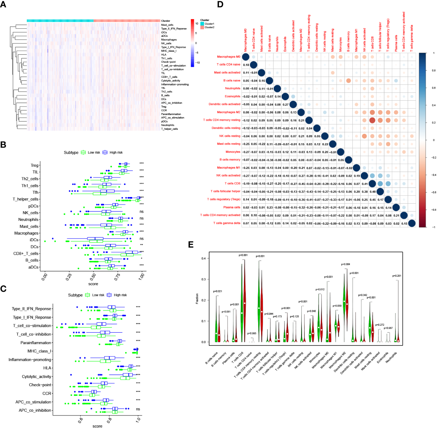 Immune infiltration pattern analysis in the TCGA cohort. (A) Relationship heatmap of the riskscore and ssGSEA scores. (B) Box plots presenting the scores of immune cells. (C) Box plots presenting the scores of immune function. (D) CIBERSORT algorithm analysis on correlations between 22 immune cell types. (E) CIBERSORT algorithm analysis the distribution of the abundance of immune cell infiltration between the high and low risk score groups. P values were shown as: ns, not significant; *P< 0.05; **P< 0.01; ***P< 0.001.