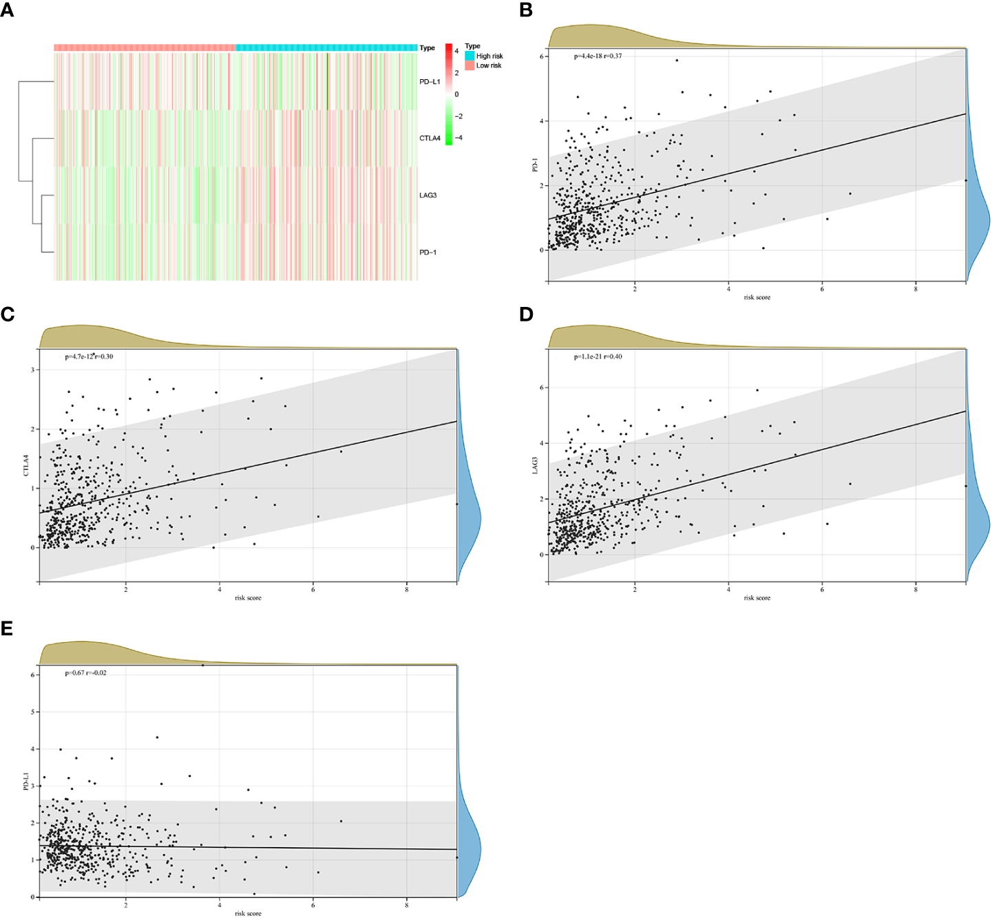 The correlations between riskscore and expression of immune checkpoint molecules in the TCGA cohort. (A) Heatmap of immune checkpoint molecules expression, including PD-1, PD-L1, LAG3 and CTLA4. (B–E)The relevance between the risk score and the expression of immune checkpoints.