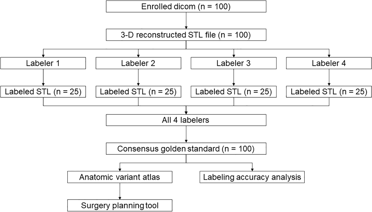 All CTs and corresponding 3-D reconstructions were equally divided into 4 sub-cohorts that were assigned to 4 senior residents or attendings specialized in thoracic surgery for labeling. The labeling process was as follows: The artery of each segment was recognized to the necessary level no more distant than sub-subsegmental branches; each branch of the subsegmental or more distal artery was segmented on the 3D model and then merged into one single STL file under the name of the segment (i.e., RA1.stl). The artery of each segment was segmented and labeled using Materialise Mimics (Materialise NV, Leuven, Belgium). Each labeling surgeon was responsible for 25 cases. To generate the golden standard, each labeled reconstruction model was cross-validated by 3 other surgeons. The golden standard was established based on the consensus of all 4 participating surgeons. The recognition accuracy of surgeons was evaluated by comparison with the golden standard (Figure 1).