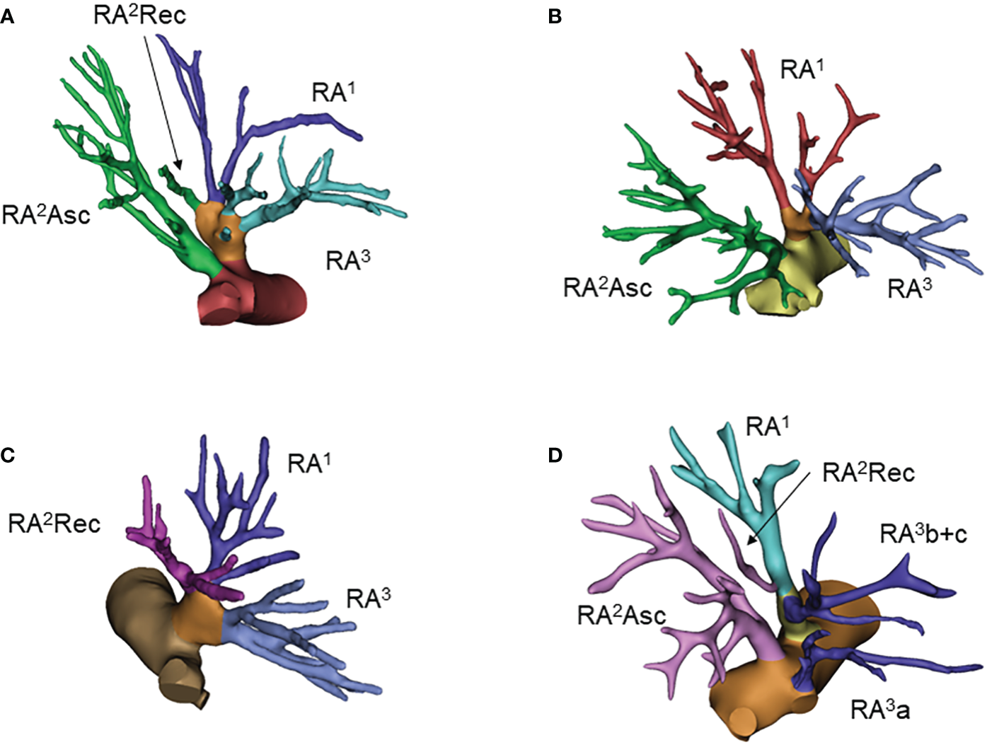 Common anatomic variants of the right upper lobe. (A) RA1+2rec+3, RA2asc; (B) RA1+3, RA2asc; (C) RA1+2rec+3; (D) RA1+2rec+3b, RA2asc, RA3a.