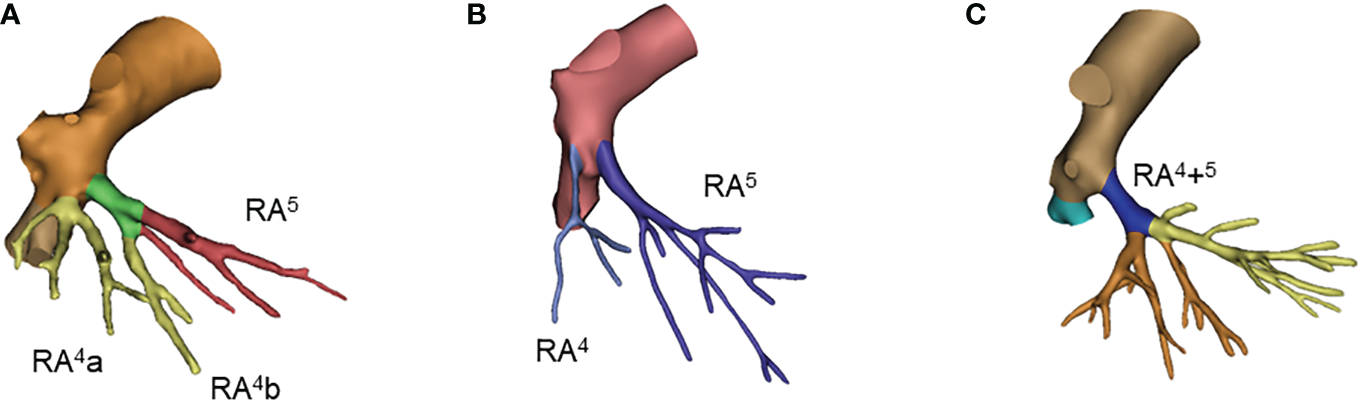 Common anatomic variants of right middle lobe. (A) RA4a+RA4b+5;(B) RA4, RA5; (C) RA4+5.