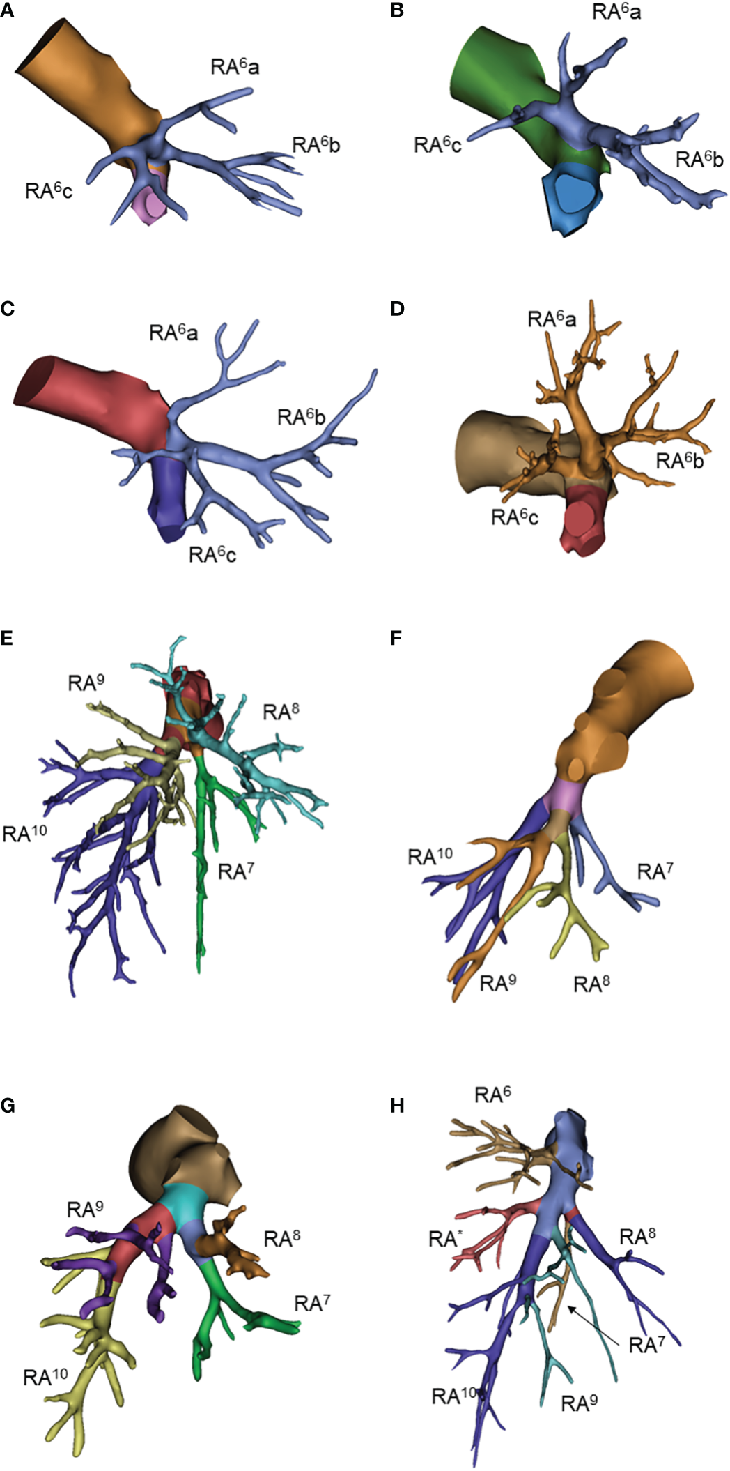 For the right superior segmental artery (RA6), we focused on the first branching point of the main trunk RA6. The three-sub-branch type was predominant that account for 50% cases, all of which was RA6a, RA6b and RA6c type. Two-sub-branch type presented as RA6a+b and RA6c, RA6a+c and RA6b, or RA6b+c and RA6a type accounted for only 50% (6%, 36% and 8%, respectively) (Table 4; Figures 4A–D, Supplementary Figure 3)