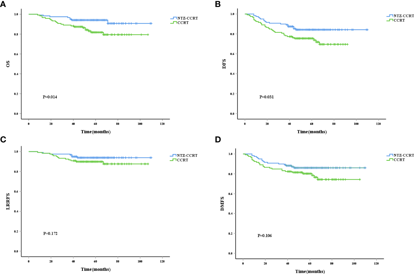 In the entire cohort, 26 patients had local recurrence, 56 patients had distant metastasis, and 39 patients died from tumor-related causes. After PSM, the 5-year OS rates in the NTZ-CCRT group and CCRT group were 94.1% vs. 81.8%, respectively (P=0.014) (Figure 1A), and the difference was statistically significant. In terms of the DFS, the 5-year DFS rates in the NTZ-CCRT group and CCRT group were 84.2% and 75.5%, P=0.031 (Figure 1B), respectively. The 5-year LRRFS rates in the NTZ-CCRT group and CCRT group were 93.9% and 89.9%, P=0.172 (Figure 1C), respectively, with no statistically significant difference. In regard to the 5-year DMFS, there were no statistically significant differences between the NTZ-CCRT group and the CCRT group (86.1% vs. 80.3%, P=0.106) (Figure 1D).