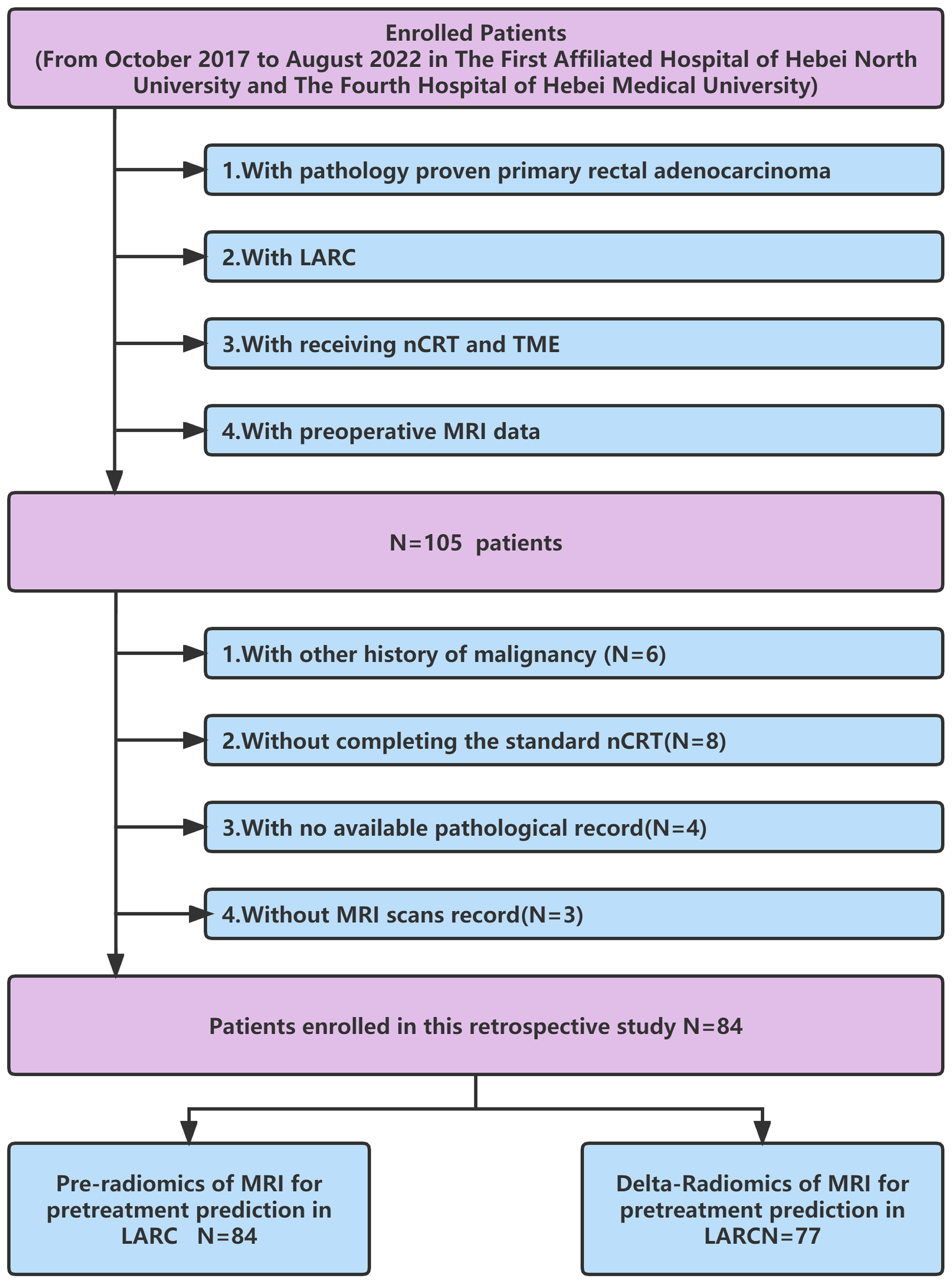 The electronic medical database contained data for 105 rectal adenocarcinoma patients (adenocarcinoma < 10 cm from rectal lower margin) who underwent the standard long-course NCRT followed by radical resection between October 2017 and August 2022 at The First Affiliated Hospital of Hebei North University and The Fourth Hospital of Hebei Medical University. The inclusion criteria were as follows: (1) histologically diagnosed with primary rectal adenocarcinoma; (2) with locally advanced rectal cancer based on enhanced chest, abdominal, and pelvic CT, rectal MRI, and transrectal ultrasound, according to the eighth edition of the Joint Cancer Board (AJCC) (32) before treatment; (3) receiving neoadjuvant chemoradiotherapy and TME; (4) with preoperative MRI data. The exclusion criteria were as follows: (1) with incomplete standard NCRT. Eight patients did not complete the standard NCRT due to intolerance and rejection; (2) with other malignancies (six); (3) with no tumor regression grading data (four); (4) with low-quality key MRI images for analysis (three). In the end, 84 patients met the inclusion criteria. Further examination revealed that postoperative imaging data for 7 patients were missing. Finally, 84 patients with pre-Radiomics of MRI and 77 patients with delta-Radiomics MRI were included in this study (Figure 1).