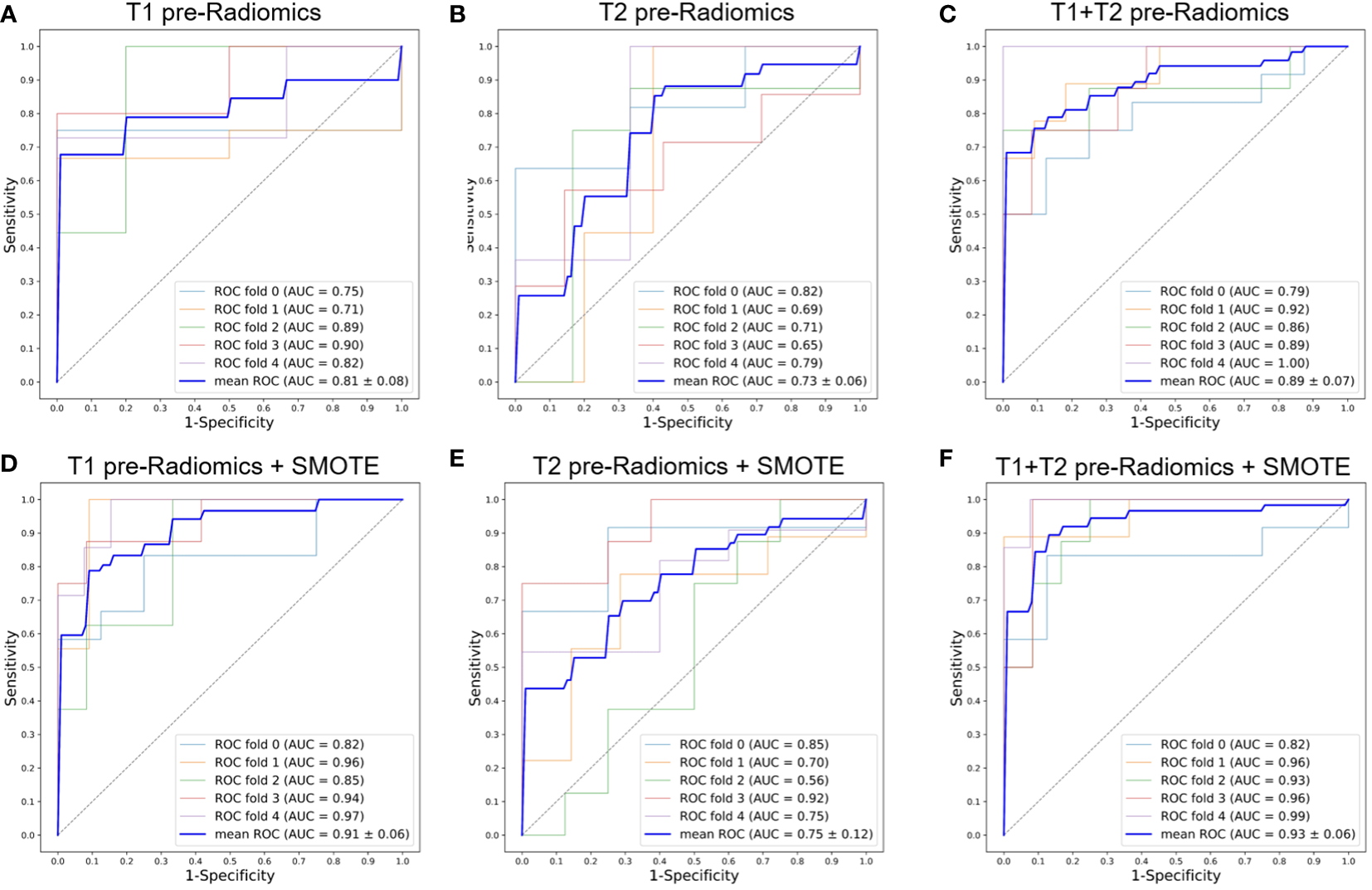ROC curves of the pre-Radiomics models with 5-fold cross-validation. (A) T1 pre-Radiomics model; (B) T2 pre-Radiomics model; (C) T1+T2 pre-Radiomics model; (D–F) The models developed by incorporating the SMOTE method. ROC, receiver operator characteristic; AUC, area under the curve; SMOTE, Synthetic Minority Oversampling Technique.