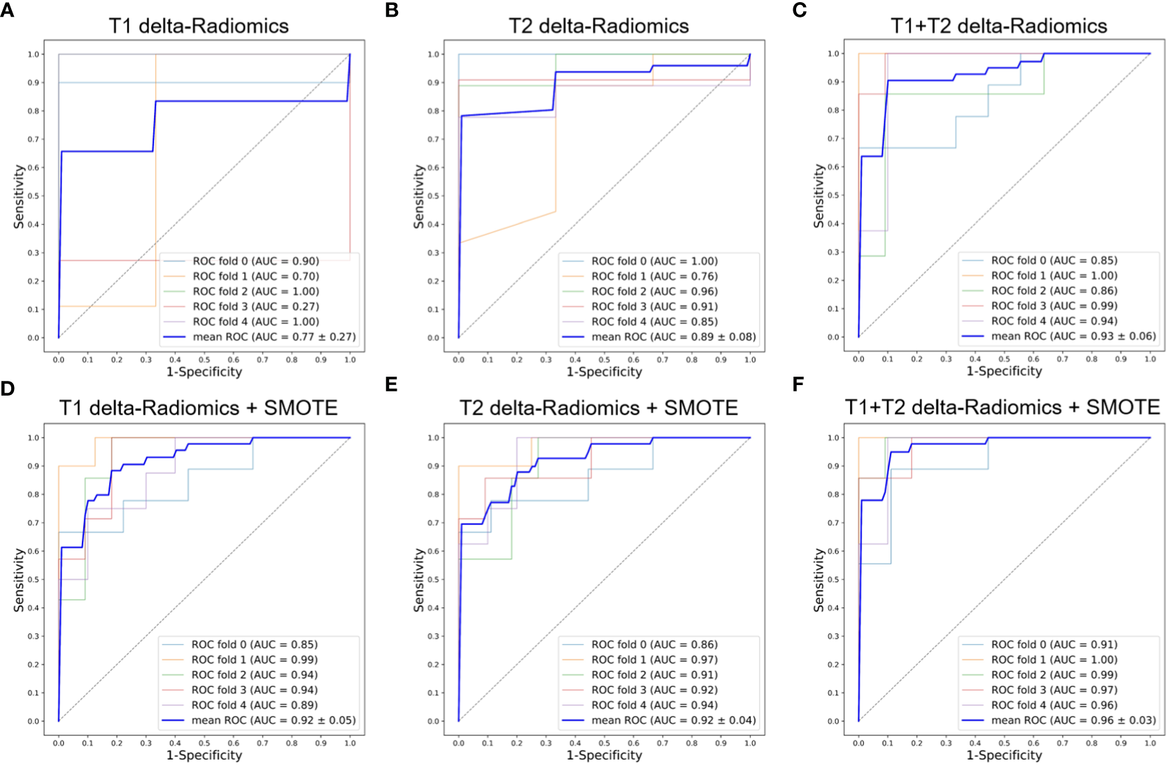 ROC curves of the delta-Radiomics models with 5-fold cross-validation. (A) T1 delta-Radiomics model; (B) T2 delta-Radiomics model; (C) T1+T2 delta-Radiomics model; (D–F) The above models were developed by incorporating the SMOTE method. ROC, receiver operator characteristic; AUC, area under the curve; SMOTE, Synthetic Minority Oversampling Technique.