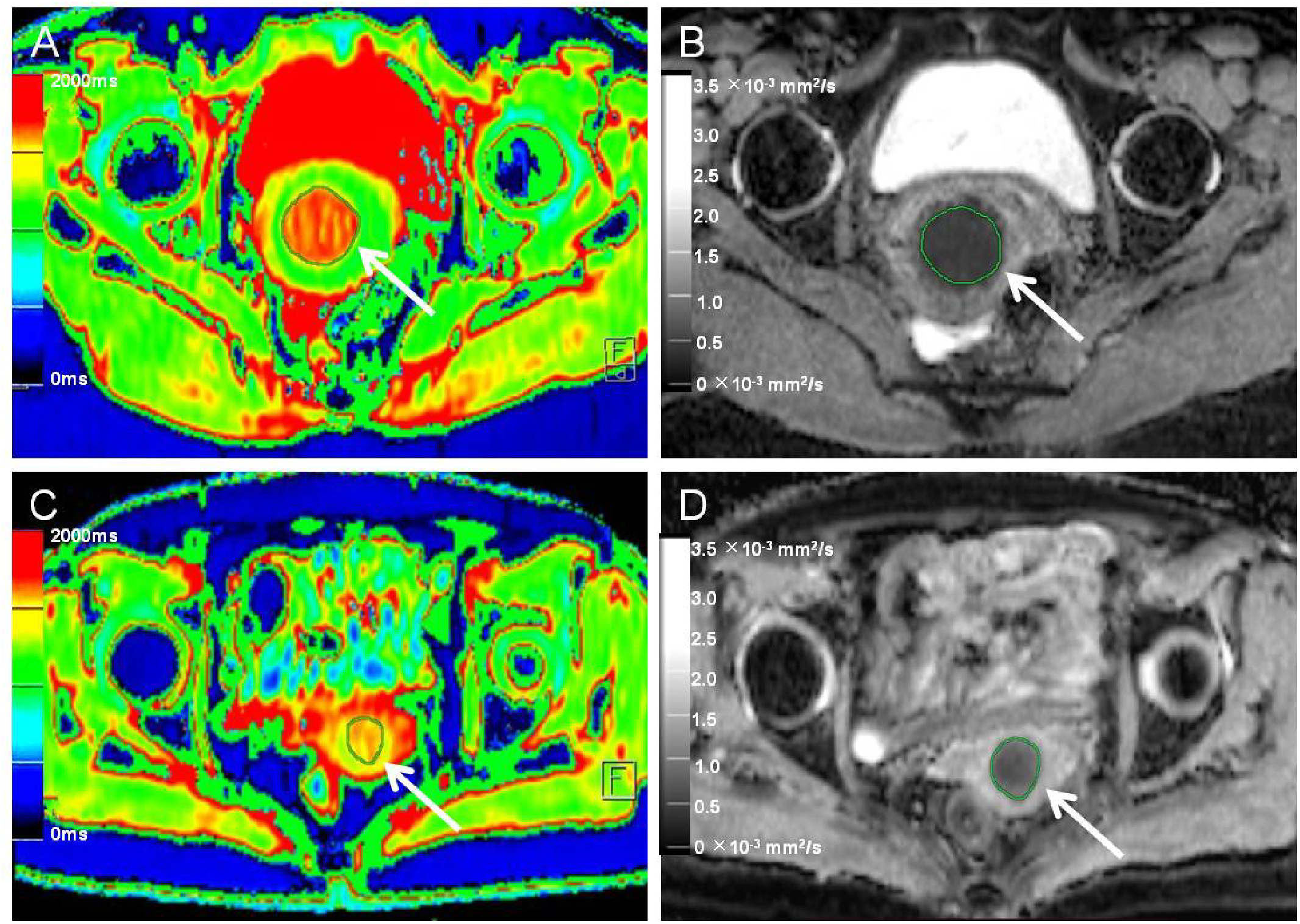 Native T1 mapping and apparent diffusion coefficient (ADC) images of recurrent and nonrecurrent cervical cancer (CC) in the surgical group. (A, B) A 45-year-old patient with recurrence during the follow-up period. (A) Axial T1 mapping pseudo-color map and (B) axial ADC image. The native T1 and ADC values were 1619.20 ms and 0.68 × 10−3 mm2/s, respectively. (C, D) A 61-year-old patient without recurrence during the follow-up period. (C) Axial T1 mapping pseudo-color map and (D) axial ADC image. The native T1 and ADC values were 1480.19 ms and 0.82 × 10−3 mm2/s, respectively. The white arrows in A-D indicate the locations of the lesions.