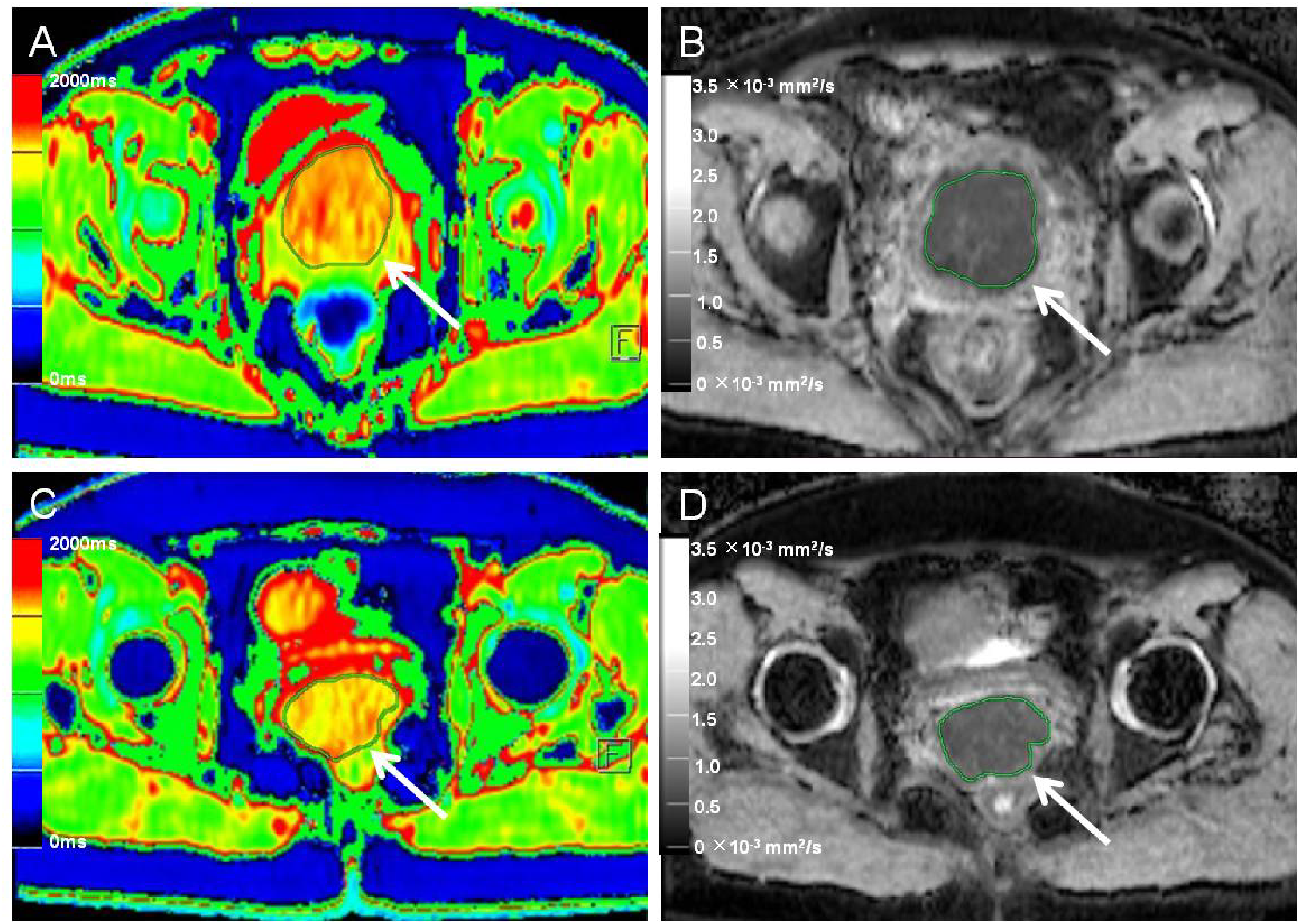 All MRI examinations were performed using a 3T MR scanner (MAGNETOM Skyra; SiemensHealthcare, Erlangen, Germany) with an 18-channel body coil and an integrated 32-channel spine matrix coil. Patients were asked to eat nothing for 4–6 hours before the examination but to drink some water to ensure that the bladder was moderately filled. The examination position was the head-first supine position. The image acquisition range was from the upper edge of the bilateral iliac bone wings to the level of the femoral neck. The patients were instructed to keep their bodies motionless and breathing calm during the scanning process. The MRI protocol included T1-weighted imaging (T1WI), T2-weighted imaging (T2WI), T1 mapping, and DWI. The detailed MRI parameters were as follows: