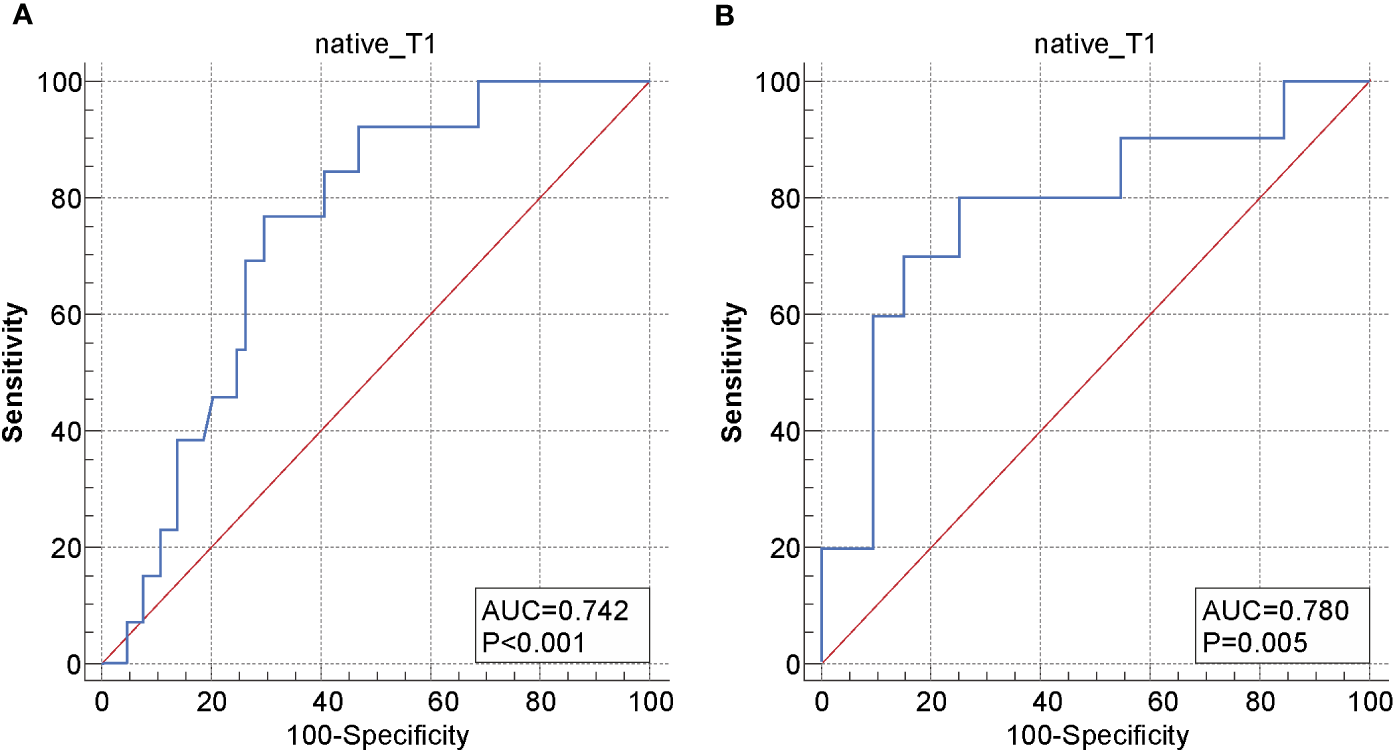 Receiver operating characteristic (ROC) curve of the native T1 values for distinguishing between the recurrence and non-recurrence subgroups in the (A) surgical and (B) non-surgical groups.
