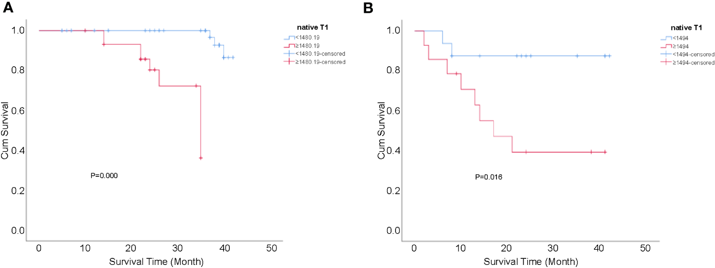 Finally, logistic regression analysis showed that associated risk factors included lymph node invasion and the native T1 value in the surgical group (P=0.003 and 0.004, respectively); meanwhile, only the native T1 value was a significant risk factor of recurrence in patients with CC after non-surgical treatment (P=0.040) (Table 4). Regardless of the surgical group or the non-surgical group, recurrence-free survival rates of CC with native T1 values higher than the optimal cut-offs (1480.19 and 1494.00 ms, respectively) were significantly lower compared with those with values lower than the optimal cut-offs (P=0.000 and 0.016, respectively) (Figure 5).