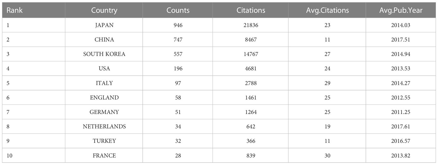 Overall, researchers from 61 countries and regions have participated in studies of laparoscopic surgery for GC. Table 2 lists the top 10 countries in terms of publication volume. Researchers in Japan have been the most productive (n=946 publications), followed by those in China (n=747) and South Korea (n=557). Japan is also the country with the most citations (n=21,836). Among the top 10 countries, the Netherlands and China have the most recent average publication years.