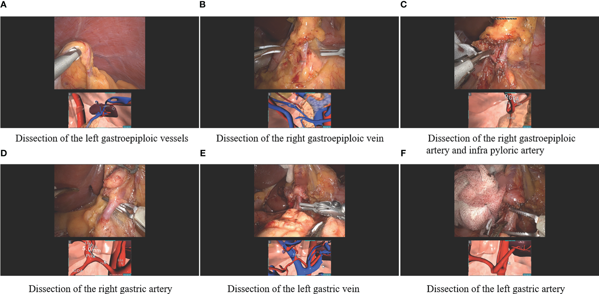 Robotic gastrectomy procedures using the patient-specific virtual 3-D surgical navigation system according to the six pre-defined points of interest (A) Dissection of the left gastroepiploic vessels, (B) Dissection of the right gastric vein, (C) Dissection of the right gastroepiploic artery and infra pyloric artery, (D) Dissection of the right gastric artery, (E) Dissection of the left gastric vein, and (F) Dissection of the left gastric artery.