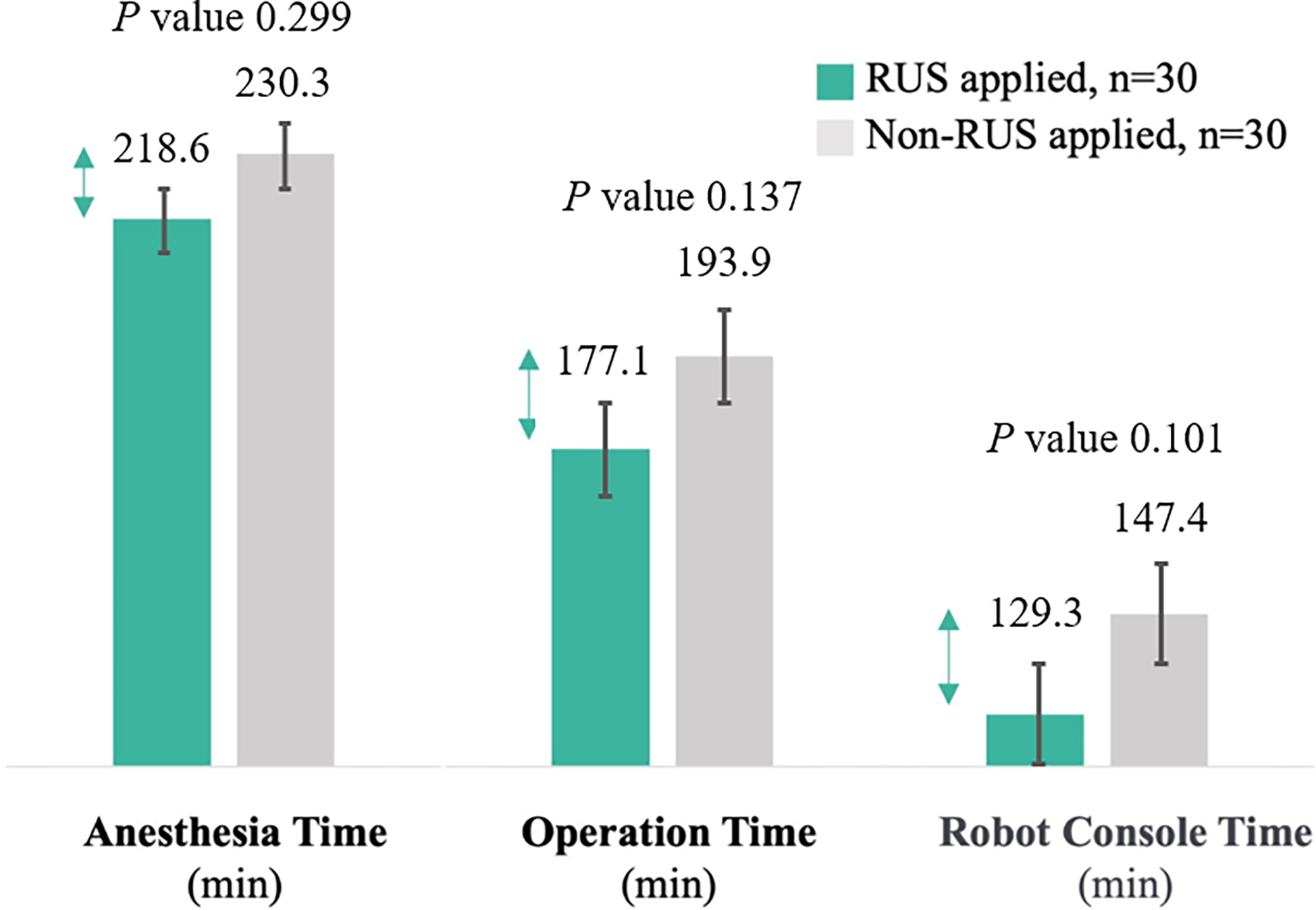 Comparison of anesthesia, operation, and console time between the experimental and control group (Error bars are used on graphs to indicate the standard error).