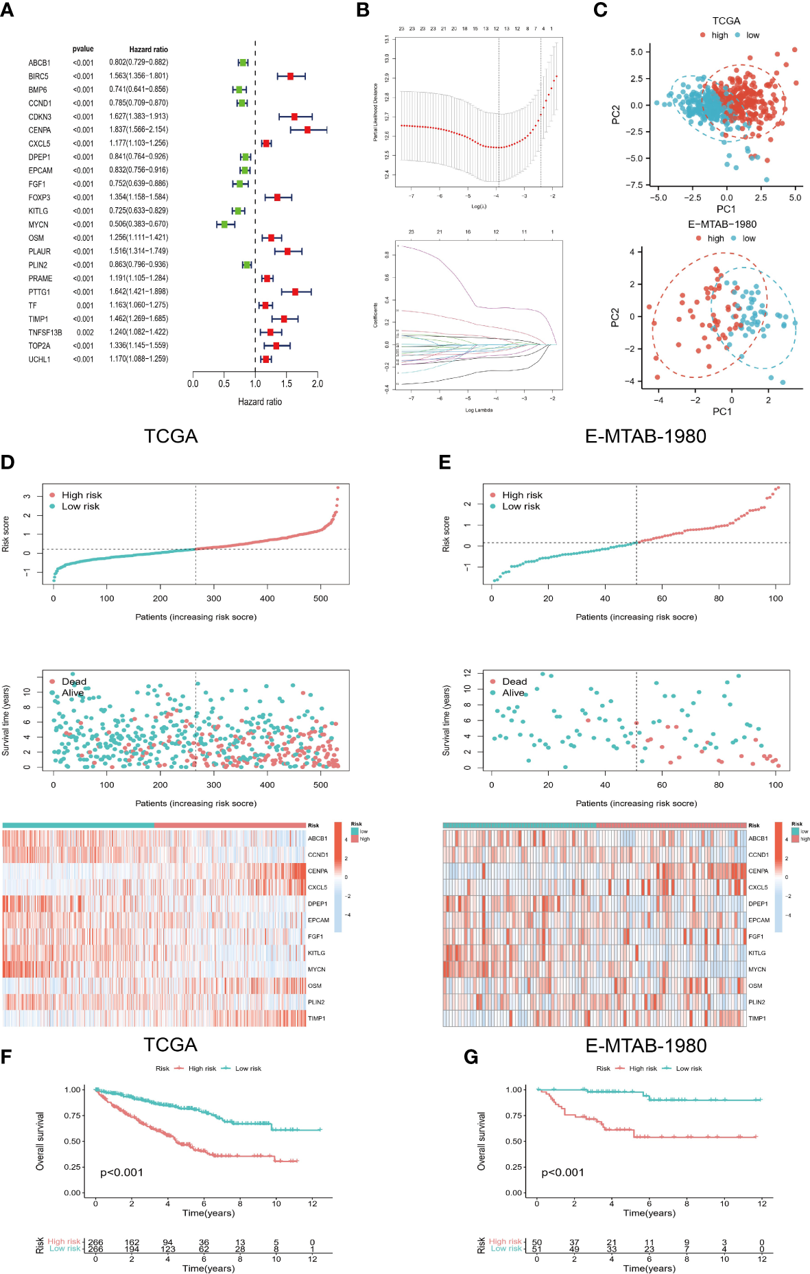 Development of risk model. (A) Prognostic genes were screened based on univariate COX regression and K-M survival analysis. (B) LASSO regression was used to construct a 12-gene-based risk model. (C) PCA analysis showed that the model genes had a good discriminatory ability. (D, E) Risk scores of TCGA and E-MTAB-1980 cohorts were correlated with survival status and model genes. (F, G) K-M survival analysis for high- and low-risk groups.