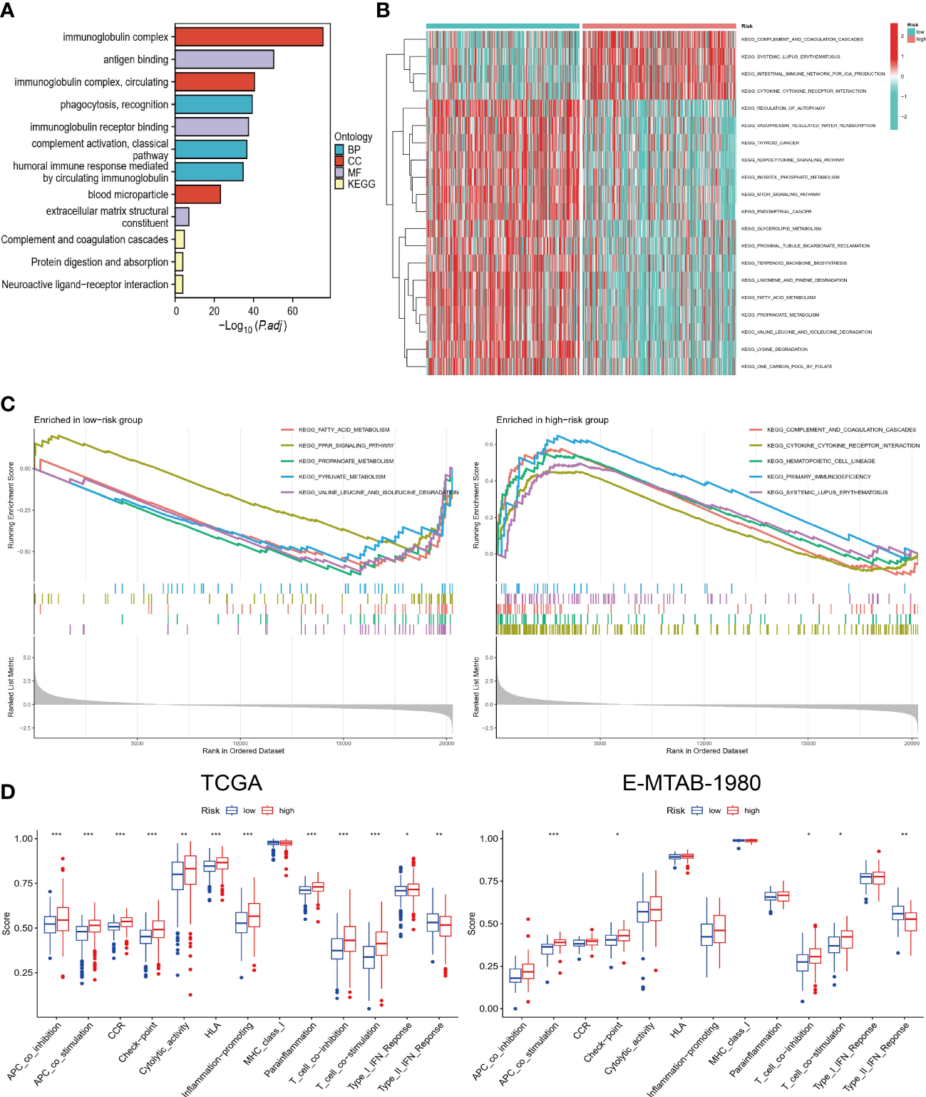 Functional and pathway enrichment analysis. (A) GO and KEGG enrichment results of DEGs. (B) GSVA in high and low-risk groups. (C) GSEA of high and low-risk groups. (D) Comparison of differences in immune-related functions between high and low-risk groups in TCGA and E-MTAB-1980 cohorts. “*”<0.5, "**" <0.01, and "***"<0.001.