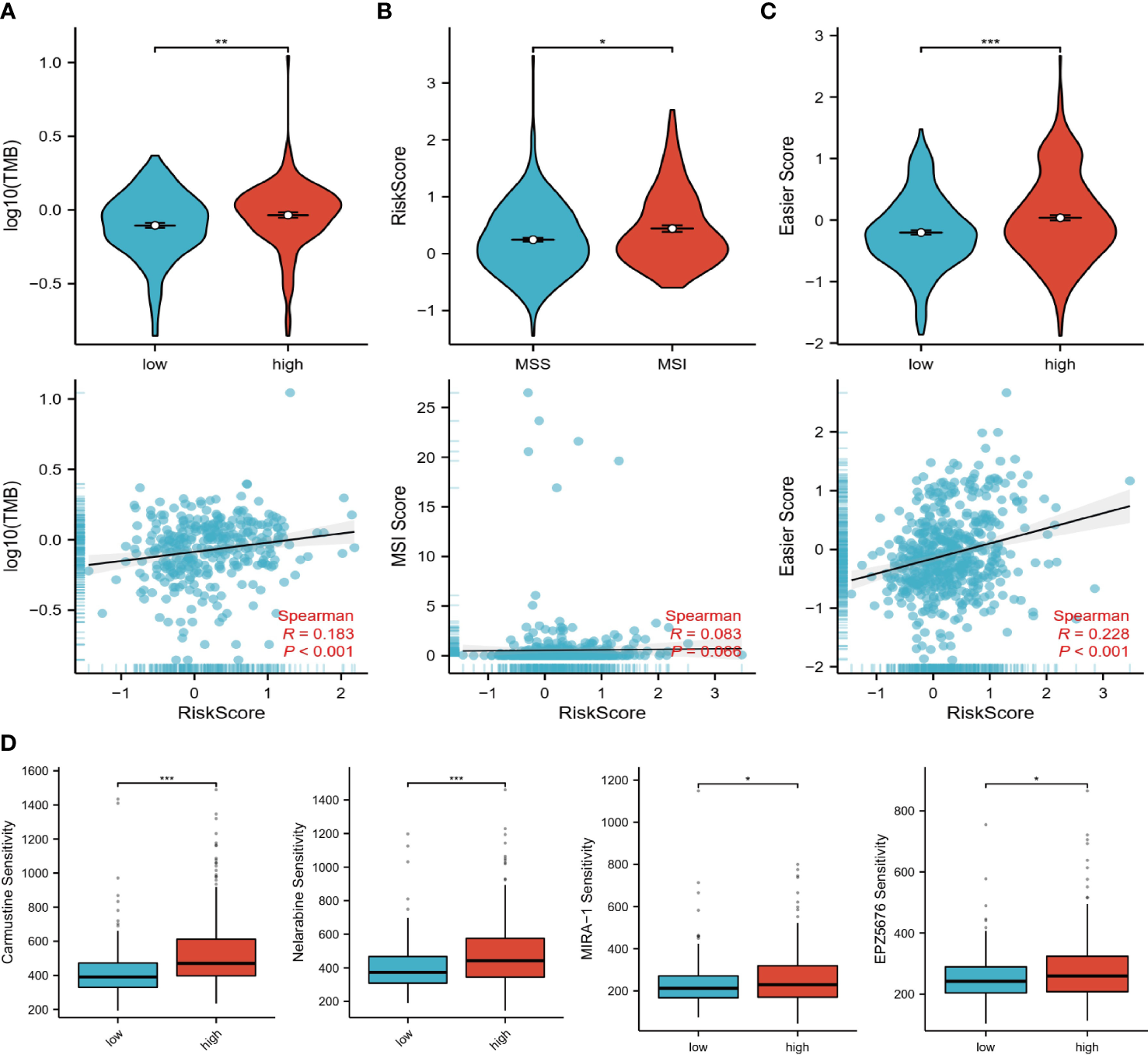 Immunotherapy and drug prediction. (A) TMB levels in high and low-risk groups, correlation of risk scores with TMB. (B) Levels of risk scores in MSI and MSS groups, correlation of risk scores with MSI scores. (C) Levels of easier scores in high and low-risk groups, correlation of risk scores with easier scores. (D) Differences in sensitivity to different drugs in high and low-risk groups. “*”<0.5, "**" <0.01, and "***"<0.001