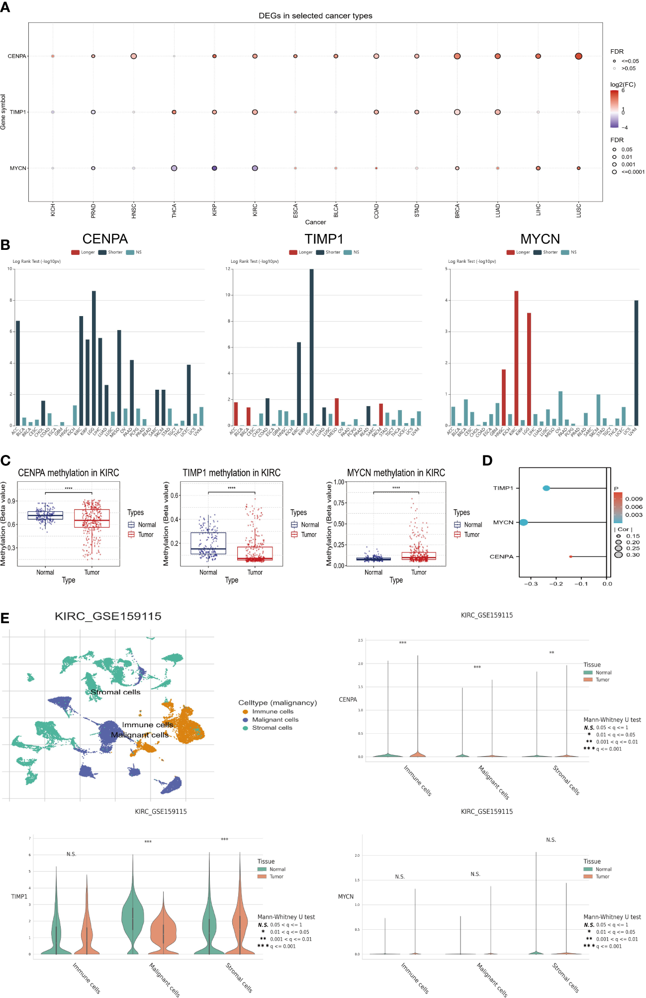 We in-depth explored the three genes with the highest risk coefficient, including CENPA, TIMP1, and MYCN. Firstly, Figure 7A demonstrates their expression levels in pan-cancer. CENPA and TIMP1 are highly expressed in the tumor tissue of most cancers, while MYCN is usually lowly expressed. We also found that they were closely associated with OS in several cancer types. As with CENPA, TIMP1 was associated with poor prognosis in most cancers. MYCN was mainly associated with good prognosis, especially in ccRCC, where higher MYCN expression was associated with longer OS in patients (Figure 7B). We also evaluated the methylation status of the three genes in tumors and normal tissues. The methylation levels of CENPA and TIMP1 were downregulated in tumor tissues, while MYCN, in contrast to them, had elevated methylation levels (Figure 7C). Moreover, their expression levels were negatively correlated with the methylation levels (Figure 7D), which suggests that methylation could be responsible for their differential expression levels. Using single-cell sequencing data from GSE159115, we further investigated CENPA, TIMP1, and MYCN expression levels in different cell types. As shown in Figure 7E, all cells can be broadly classified into three types, including immune cells, malignant cells, and stromal cells. Compared with normal tissues, CENPA expression in tumor tissues was elevated in all three cell types; TIMP1 was elevated in stromal cells and decreased in malignant cells; MYCN expression levels were not significantly different in different cell types.