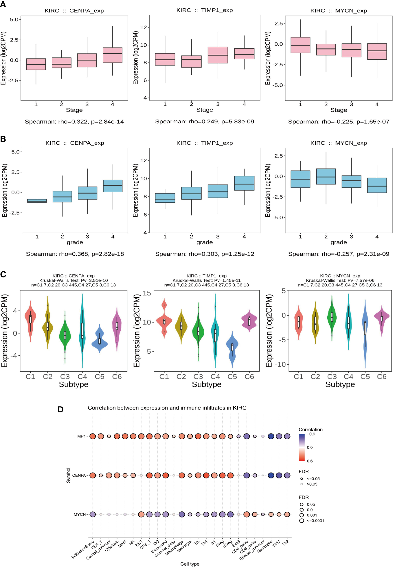 Subsequently, we analyzed the relationship of CENPA, TIMP1, and MYCN with the clinical features and TME of ccRCC. To begin with, the expression levels of CENPA and TIMP1 increased with the tumor stage, while MYCN did the opposite (Figure 8A). A similar trend was observed in tumor grade, where the expression levels of CENPA and TIMP1 were positively correlated with grade and that of MYCN was negatively correlated (Figure 8B). Based on these genes, ccRCC can be classified into different immune subtypes (Figure 8C), suggesting a close relationship between them and the tumor’s TME. This is further confirmed by the analysis presented in Figure 8D, where CENPA and TIMP1 were positively correlated with the infiltration level of most immune cells, and MYCN showed the opposite trend (Figure 8D). Therefore, we believe that CENPA, TIMP1, and MYCN are all therapeutic targets with significant potential in ccRCC.