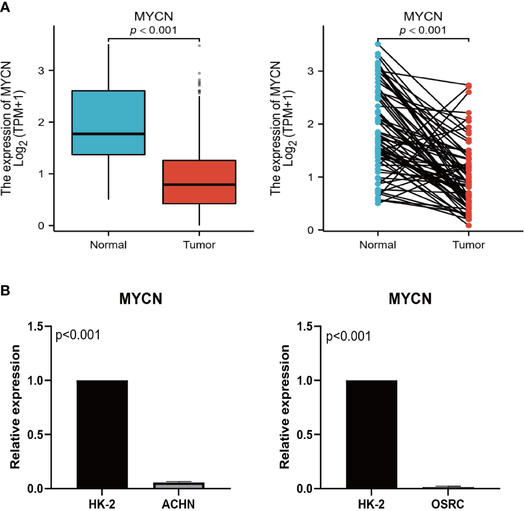 Expression validation of MYCN. (A) Expression levels of MYCN in TCGA unpaired and paired samples. (B) Expression levels of MYCN in HK-2, ACHN, and OSRC cell lines.