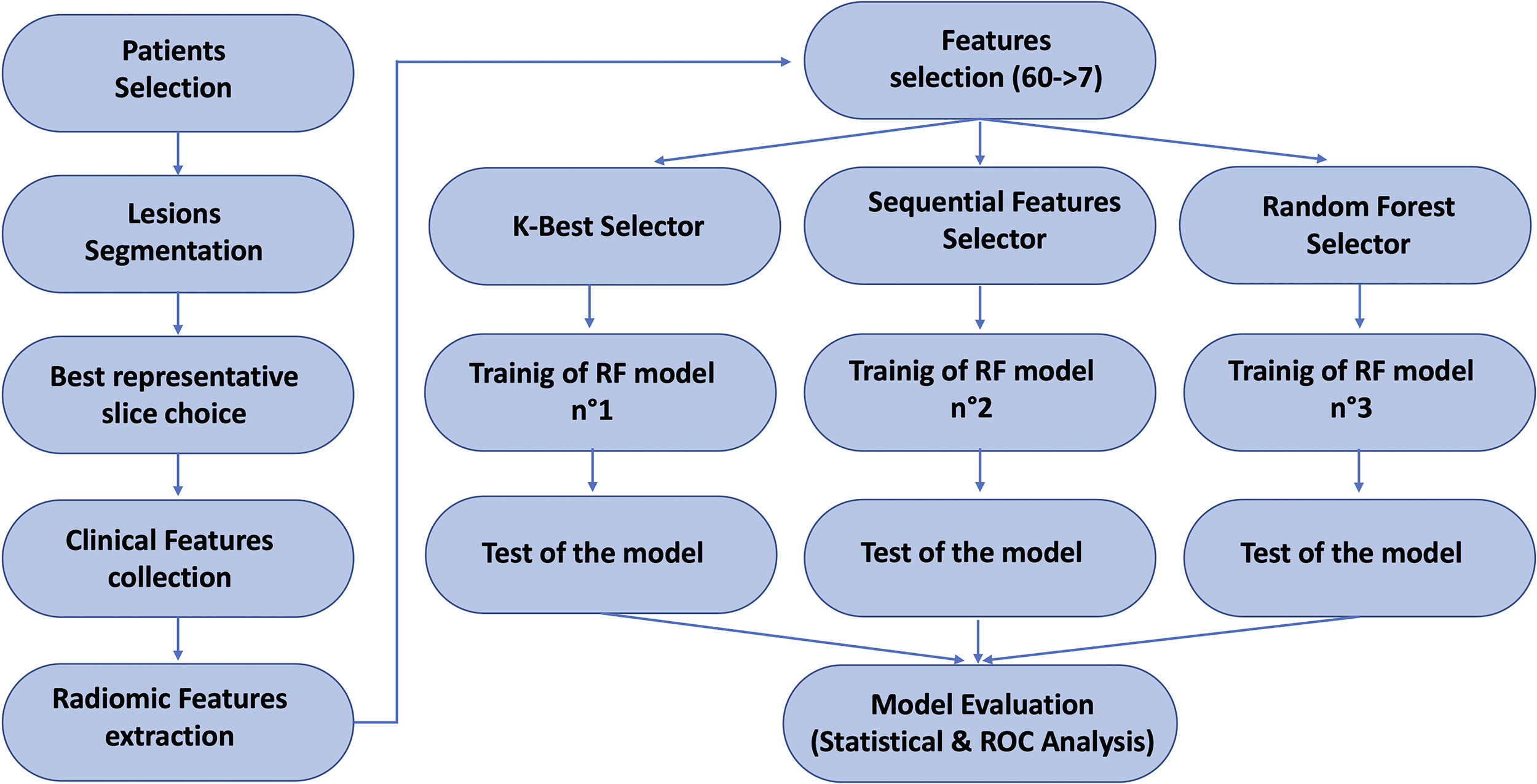 There are few studies concerning the analysis of DBT images and eventually the introduction into clinical practice of methods of automatic cancer detection (9–12). However, the scientific interest in radiomics and artificial intelligence (AI) methods in this setting is rapidly expanding. In this scenario, the aim of our project was the construction of a predictive model of lesion malignancy based on the radiomic features extracted by DBT images and on the clinical and anatomopathological characteristics of the lesions, which could assist radiologists in their first level diagnosis.