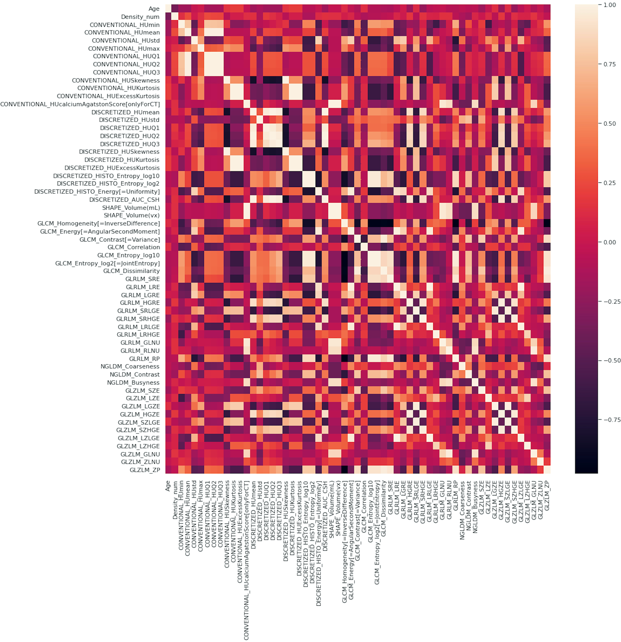 Correlation matrix of the complete set of variables, clinical plus radiomic.