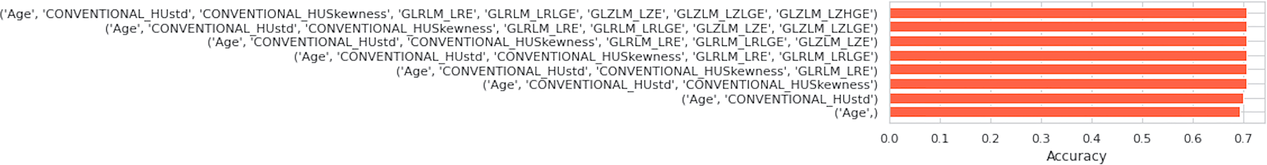 Based on the Mann-Whitney test, the following features resulted to be significantly different (p < 0.05) between benign and malignant lesions: (1) age, (2) density, (3) CONVENTIONAL_HUKurtosis, (4) CONVENTIONAL_HUExcessKurtosis, (5) GLCM correlation, (6) GLRLM_LRLGE, (7) GLRLM_SZE, and (8) GLRLM_SZHGE.
