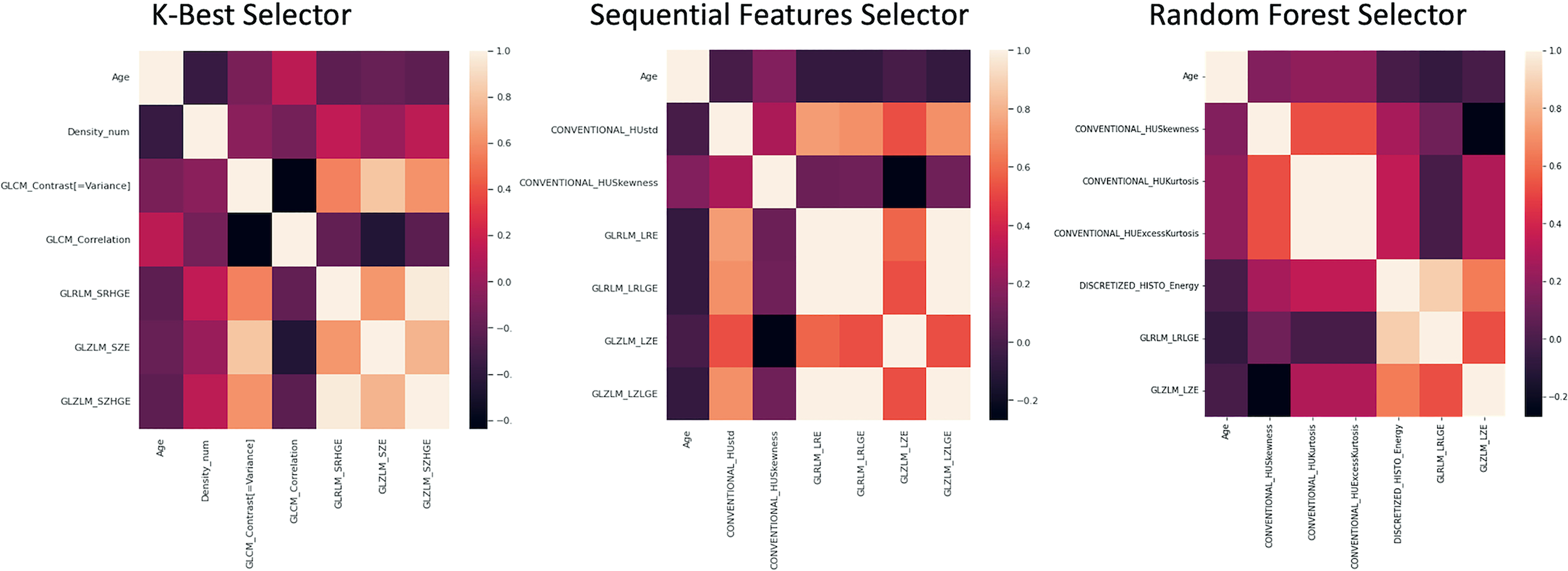 Correlation matrices of the 7 features obtained by KB, S and RF selection method are shown.