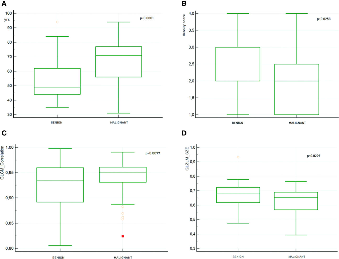 Boxplot together with the p value of 4 most representative selected features. (A) Patient’s age (B) Breast density (C) GLCM_Correlation (D) GLZLM_SZE.
