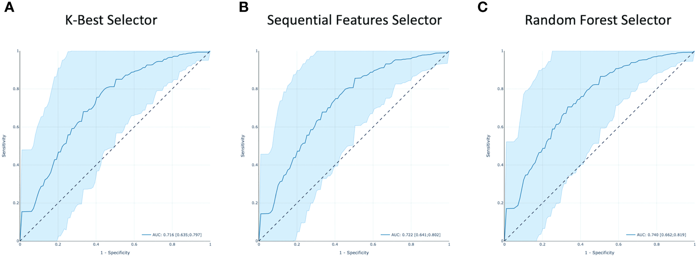 In this study, three feature selection methods were used, and consequently, three predictive models were derived. The resulting diagnostic performances of the 3 models are quite similar. The model derived from the RF Selector showed a slightly better performance with respect to the KB and S Selectors yielding AUC values of 0.740 [CI 0.662–0.819], 0.716 [CI 0.635–0.797], and 0.722 [CI 0.641–0.802], respectively.
