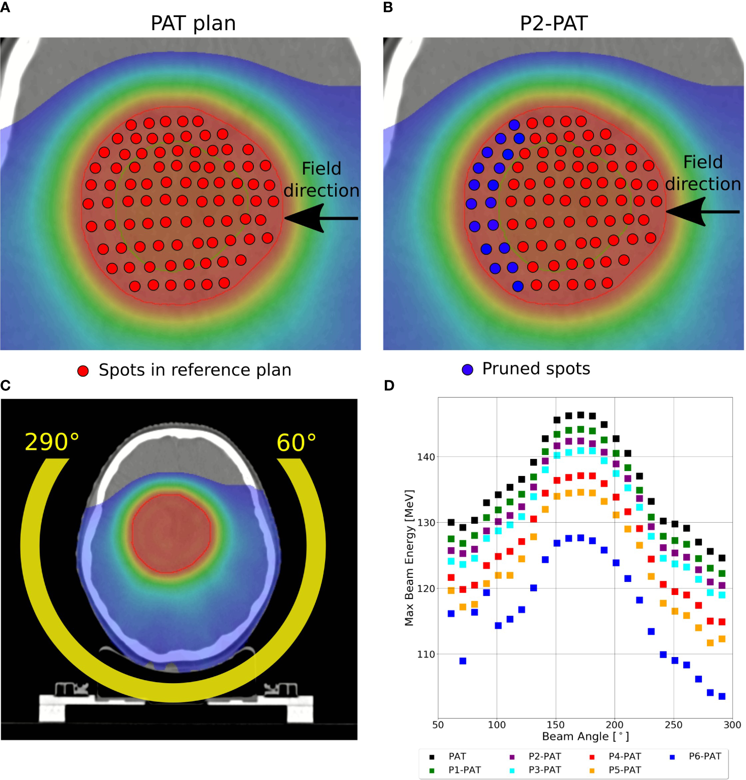 (A) Illustration of a spot map for a PAT plan, and (B) the P2-PAT plan where the blue color represents the pruned spots in this map. The red outline shows the PTV, and the green outline shows the shrunken PTV volume. The margins created for the shrunken PTV in both lateral and proximal direction makes the PTV smaller in only the distal part. (C) shows the beam positioning for the arc around the tumor volume and (D) shows the maximum energy from each beam in the arc.