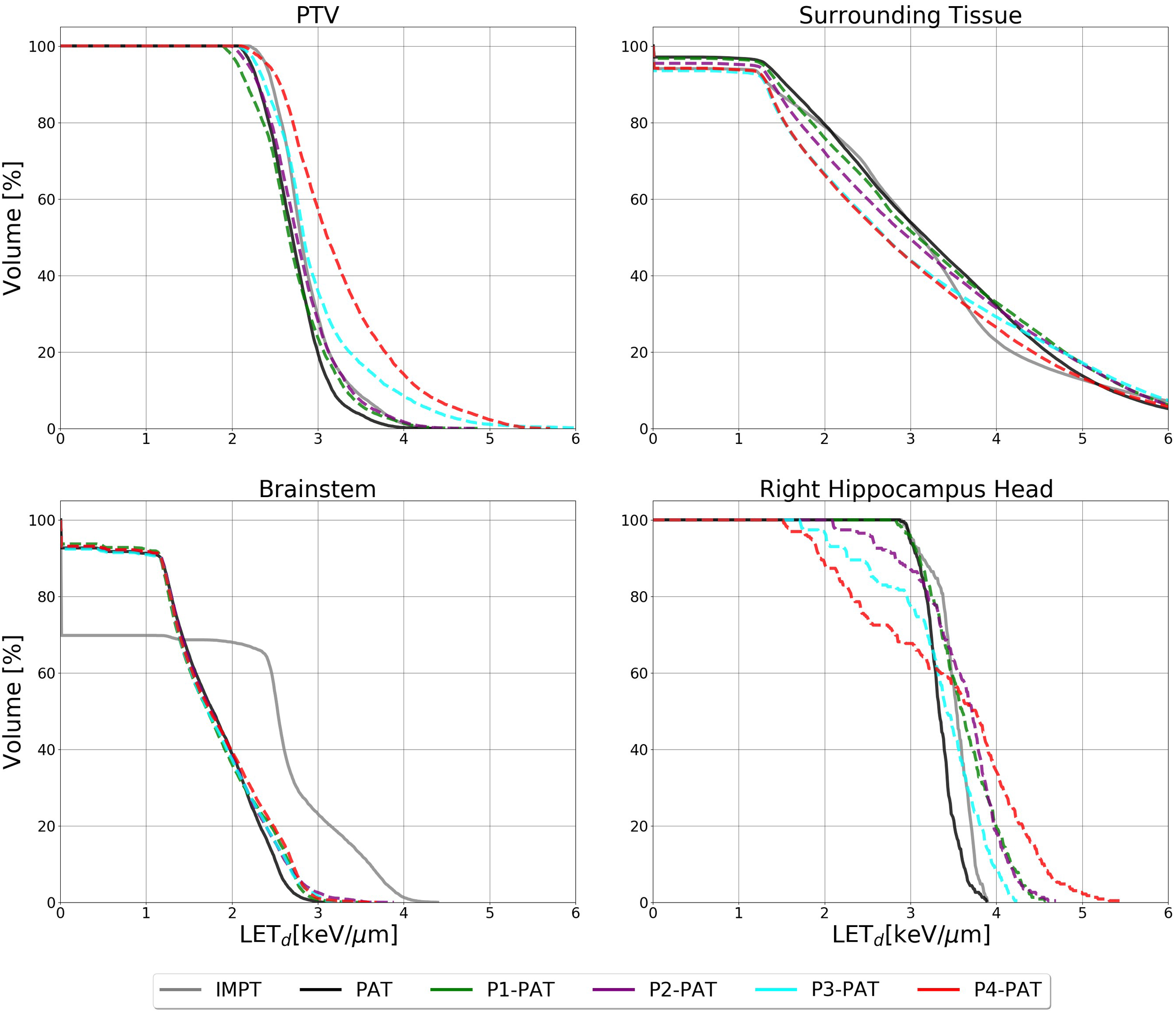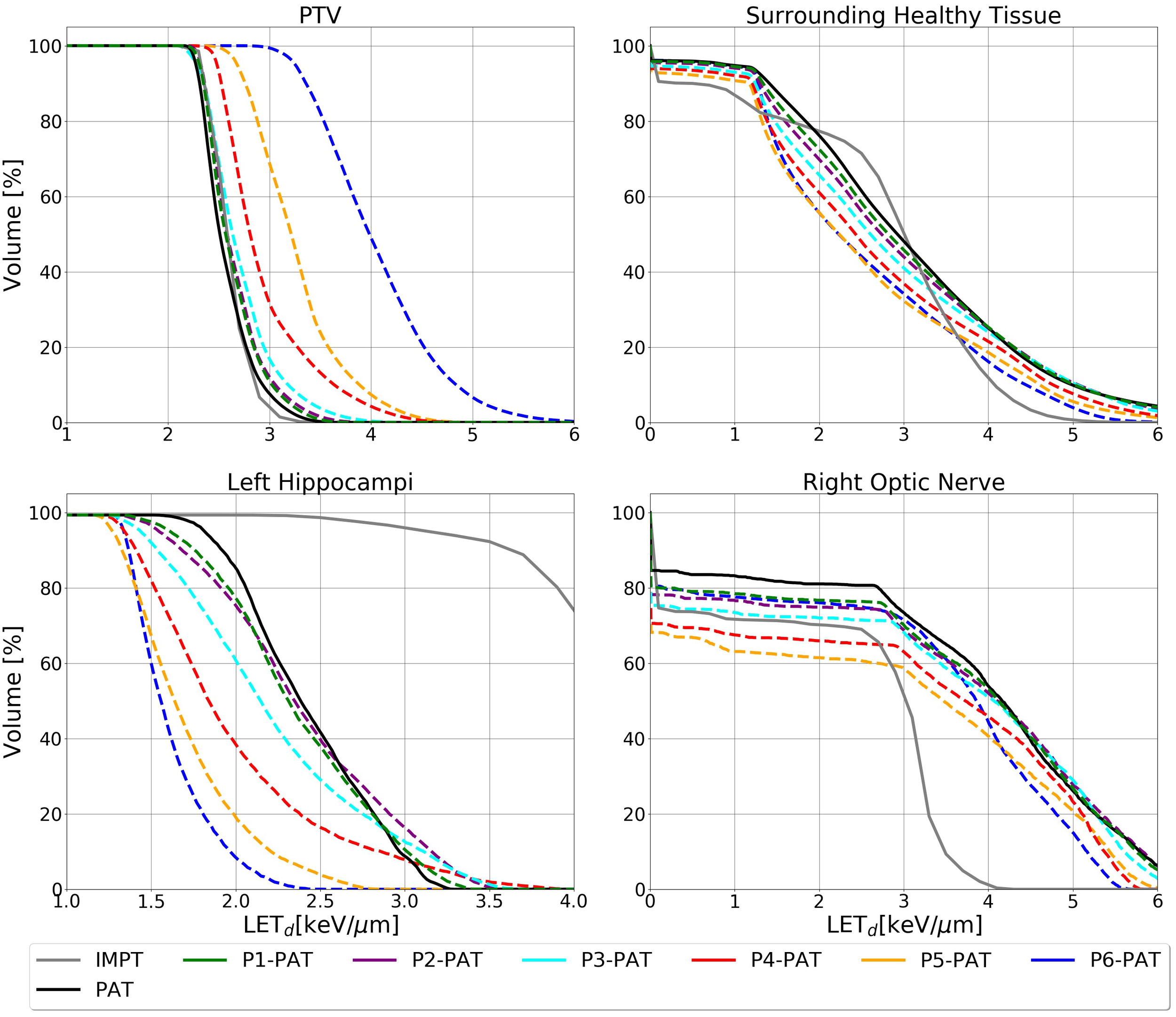 LETd volume histogram for the PTV, surrounding healthy tissue and the OARs calculated with 2 Gy(RBE1.1) dose cutoffs for the germinoma case. The dashed lines represent the P-PAT plans, while the solid black lines represent the PAT plan and the solid gray line represent the IMPT plan.