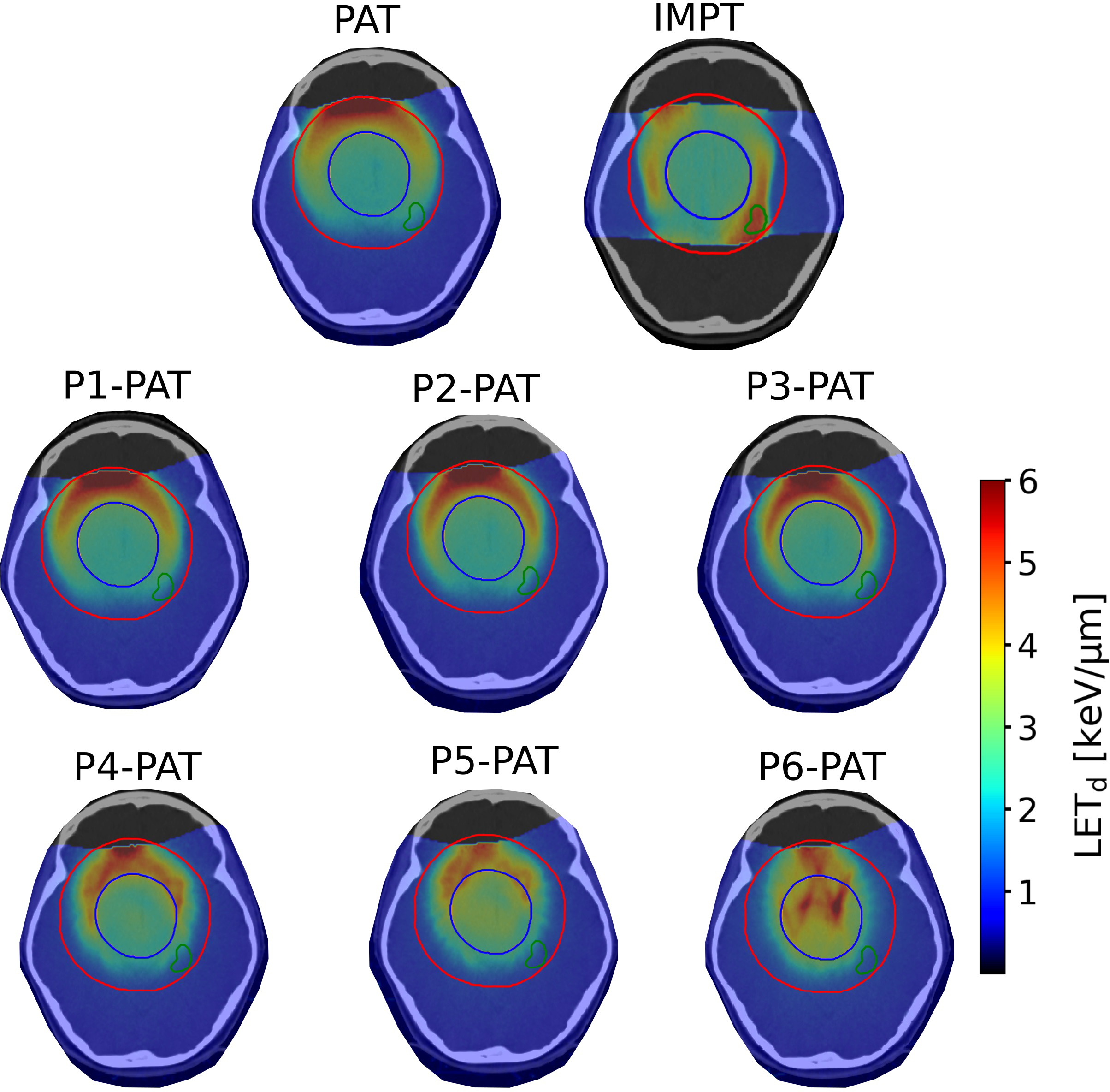 When comparing IMPT to PAT, we see clear differences, both in terms of RBE-weighted dose, and LETd. The mean LETd in the PTV for the IMPT plan is similar to the PAT plan, with the P4-, P5-, and P6-PAT plans provided an elevation of 0.35, 0.76 and 1.45 , compared to the IMPT plan, respectively. The LETd difference in the OARs, however were substantial, as the IMPT plan provided a 2.0 increase in the left hippocampus and a 0.9 reduction in the left optic nerve, with a 2 Gy(RBE) cutoff. These differences were smaller for higher cutoff values.