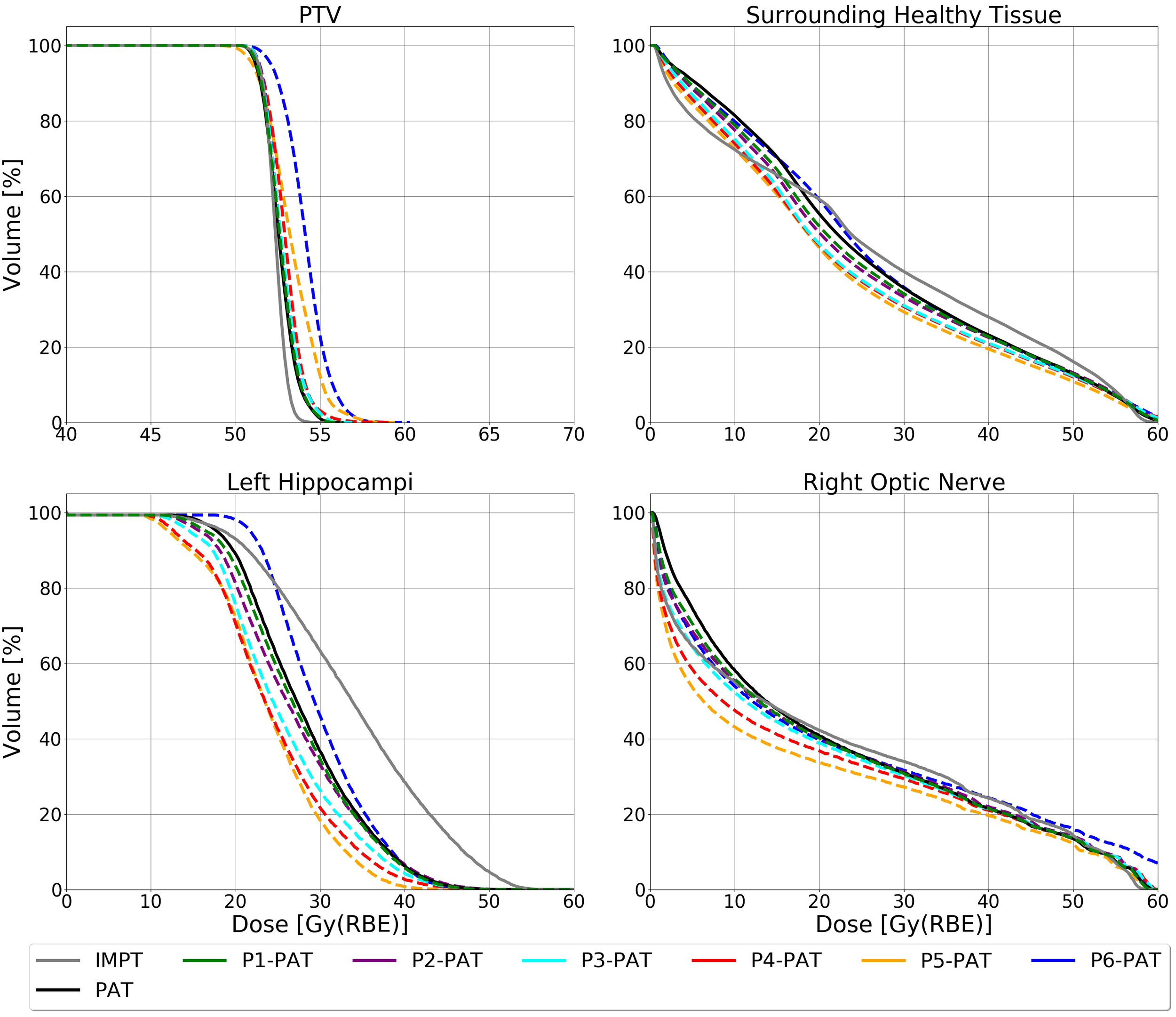 DVHs for the PTV (only showing doses between 40 and 70 Gy(RBE)), surrounding healthy tissue and the OARs calculated with the ROR model for the germinoma case. The dashed lines represent the P-PAT plans, while the solid black and gray line represents the PAT plan and IMPT plan, respectively.