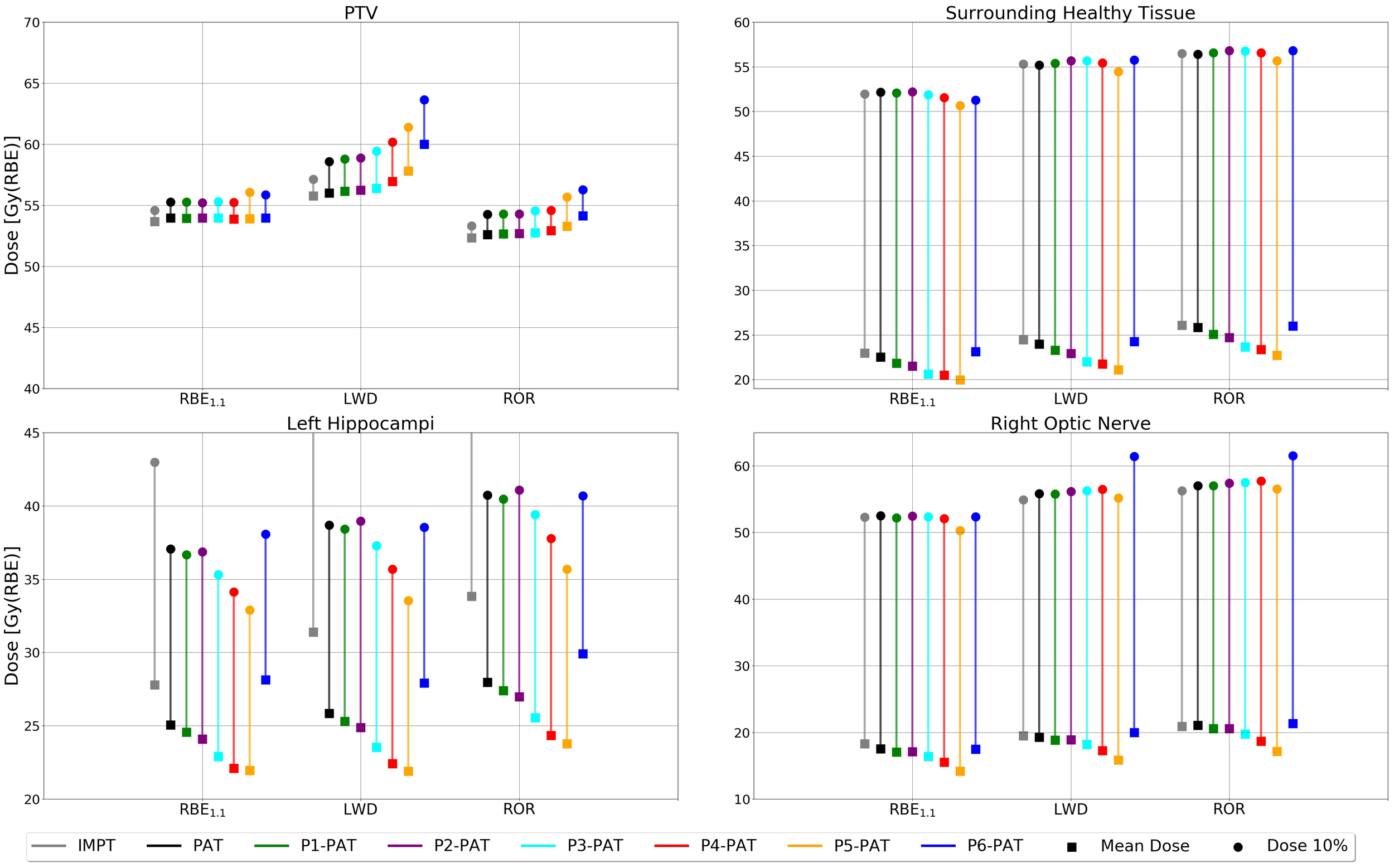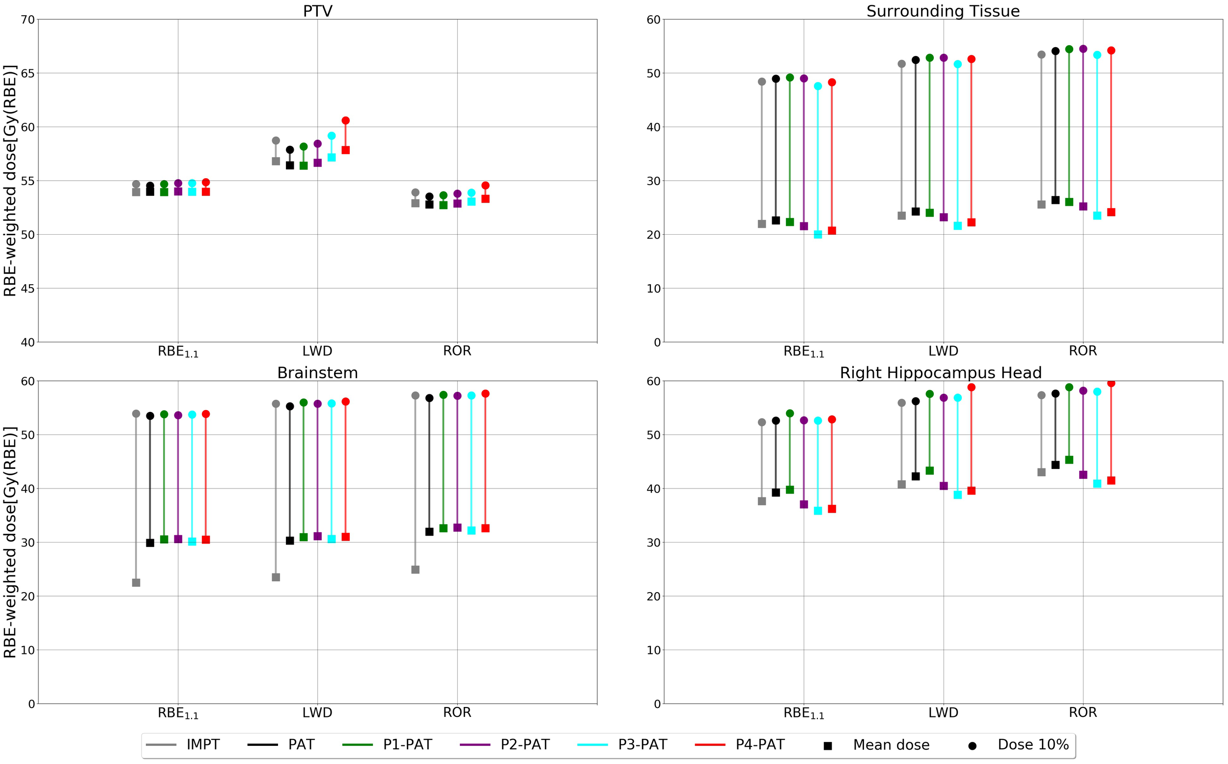 We also saw a higher RBE-weighted dose to the surrounding healthy tissue for the PAT plan compared to the IMPT (Figure 6). However, this is due to the increased physical dose, where the IMPT plan provided 2.24 and 5.78 Gy(RBE) higher RBE1.1-weighted dose to the left hippocampus compared to the PAT plan and P5-PAT plan, respectively.