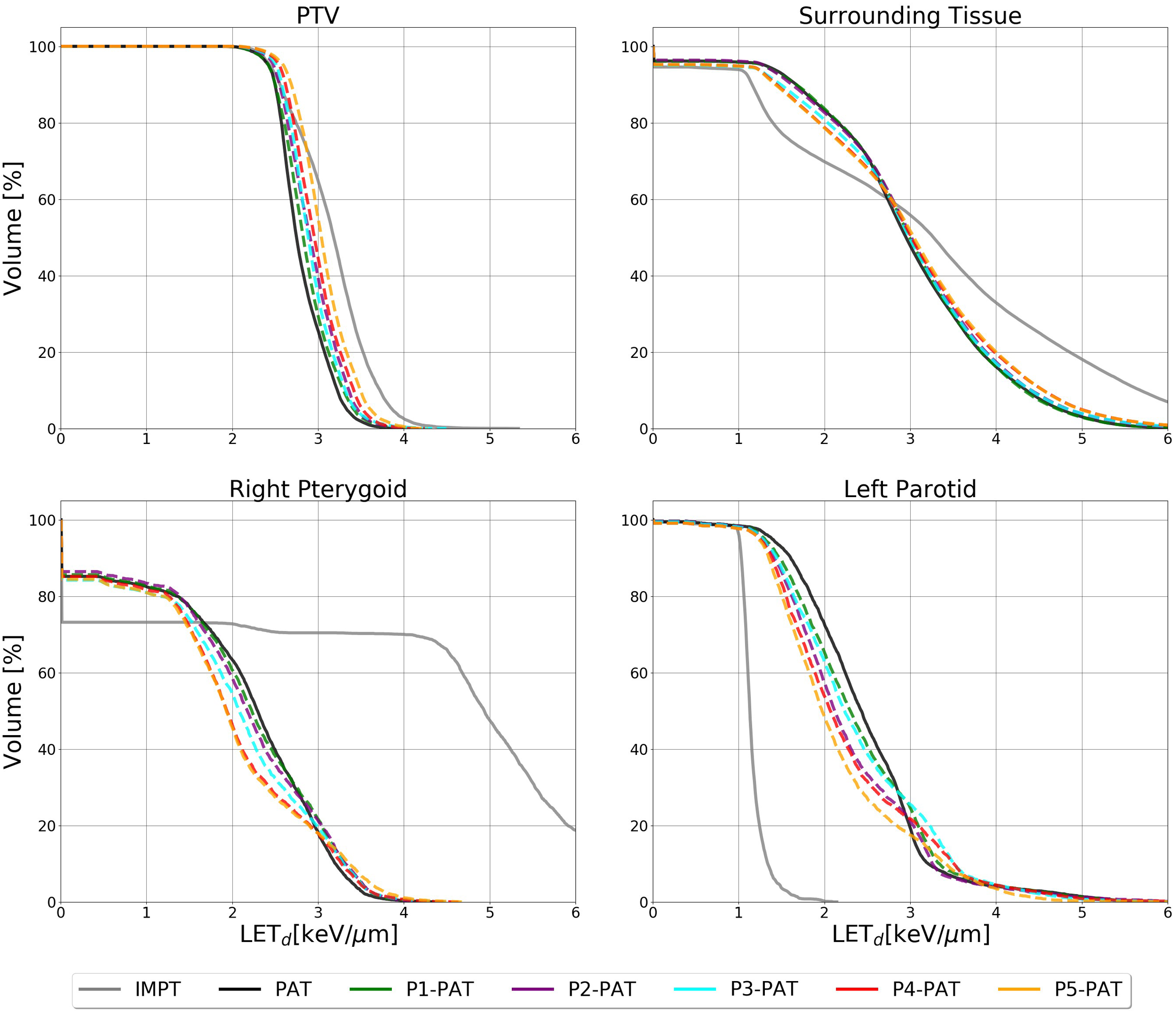 LETd volume histogram for the PTV, surrounding healthy tissue and the OARs calculated with 2 Gy(RBE1.1) dose cutoffs for the rhabdomyosarcoma case. The dashed lines represent the P-PAT plans, while the solid black and gray lines represent the PAT plan and IMPT plan, respectively.