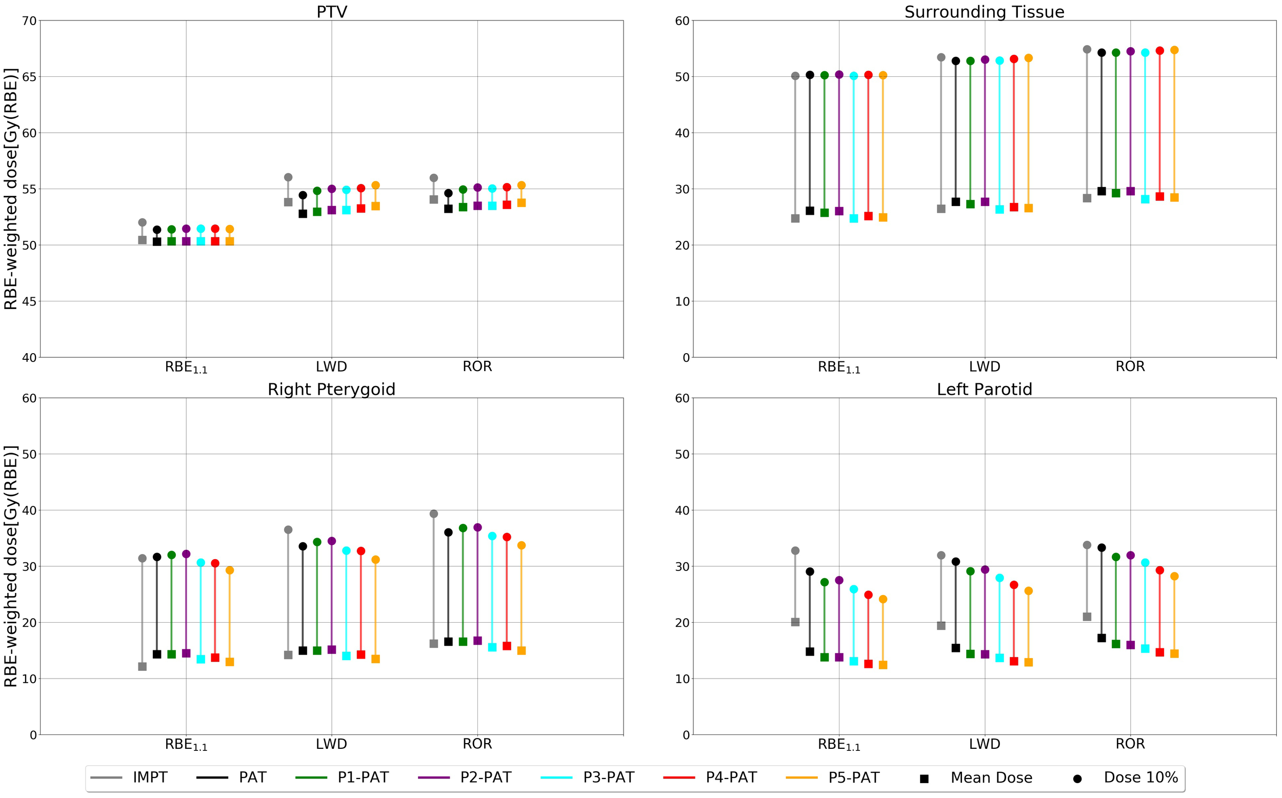 There is, however, a clear decrease in both the mean and max (D10%) RBE-weighted dose for the P-PAT plans in both OARs for all RBE models (Figure 10). The RBE-weighted dose in the PTV was also higher for the variable RBE models compared to the plan recalculated with RBE1.1, with a mean dose of 2.96 and 2.48 Gy(RBE) for the PAT plans recalculated with the ROR and LWD model, respectively. Compared to the PAT plan, the mean RBE1.1-weighted dose to the left parotid and right pterygoid were 5.2 Gy(RBE) higher and 2.2 Gy(RBE) lower for IMPT, respectively. This is an indication that the tumor location is an important parameter when comparing PAT and IMPT. Additional results for the rhabdomyosarcoma case can be found in the Supplementary Material.