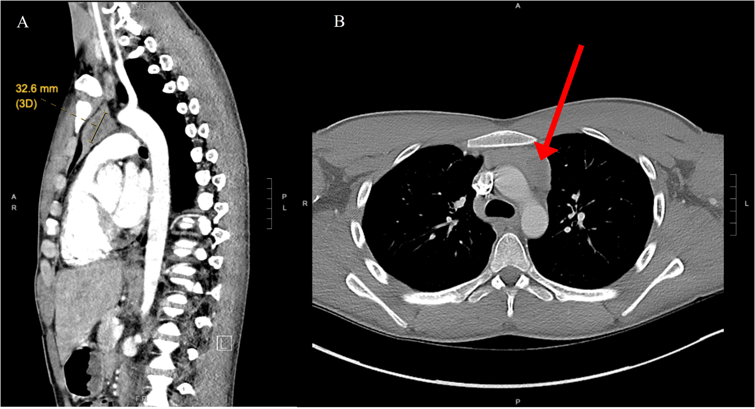 (A) Nodular area with central low density in the left side of the thymus, measuring roughly 32 mm long axis indicative of mediastinal seminoma (yellow indicator). (B) Computed tomography of axial chest demonstrates anterior mediastinal mass (red arrow).