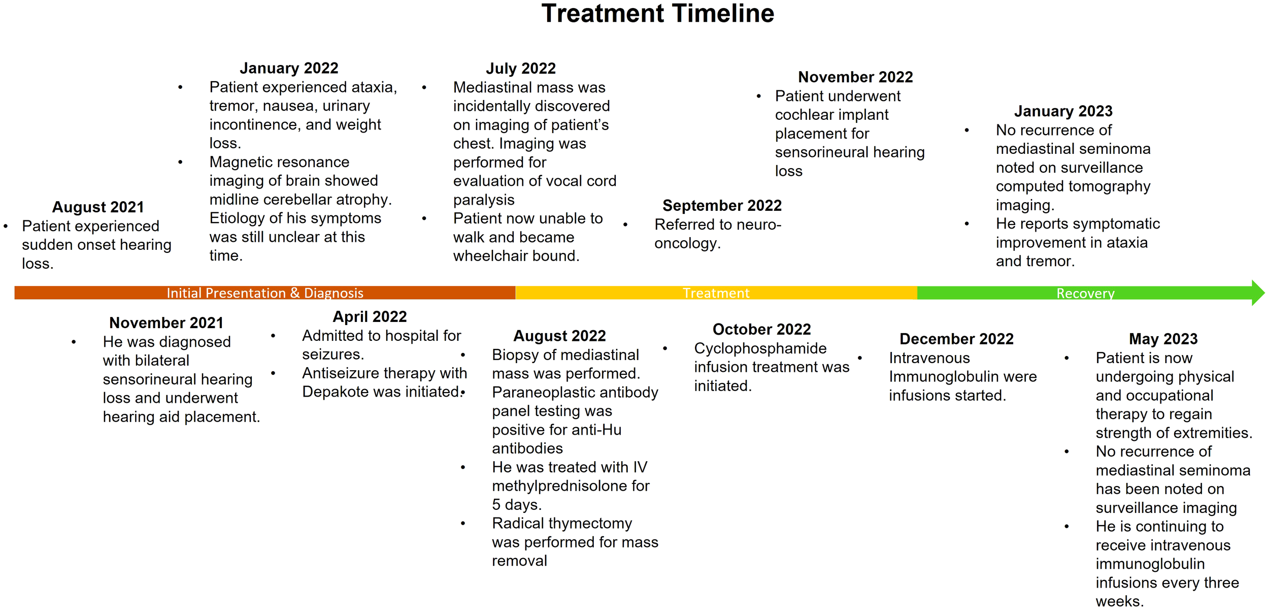 A detailed diagnosis and treatment timeline of mediastinal seminoma with paraneoplastic anti-Hu encephalitis.