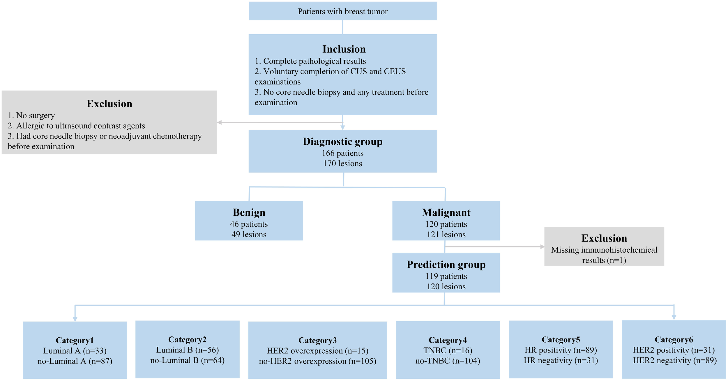 The inclusion/exclusion flow chart. n = number of lesions. Luminal A: ER and/or PR+, HER2-, Ki-67<14%; Luminal B (HER2-): ER and/or PR+, HER2-, Ki-67≥14%; Luminal B (HER2+): ER and/or PR+, HER2+, any Ki-67; HER2 overexpression: ER and/or PR-, HER2+. TNBC: ER-, PR-, HER2-. CUS, conventional ultrasound; CEUS, contrast-enhanced ultrasound; ER, estrogen receptor; PR, progesterone receptor; HER2, human epidermal growth factor receptor 2; TNBC, triple-negative breast cancer; HR, hormone receptor.