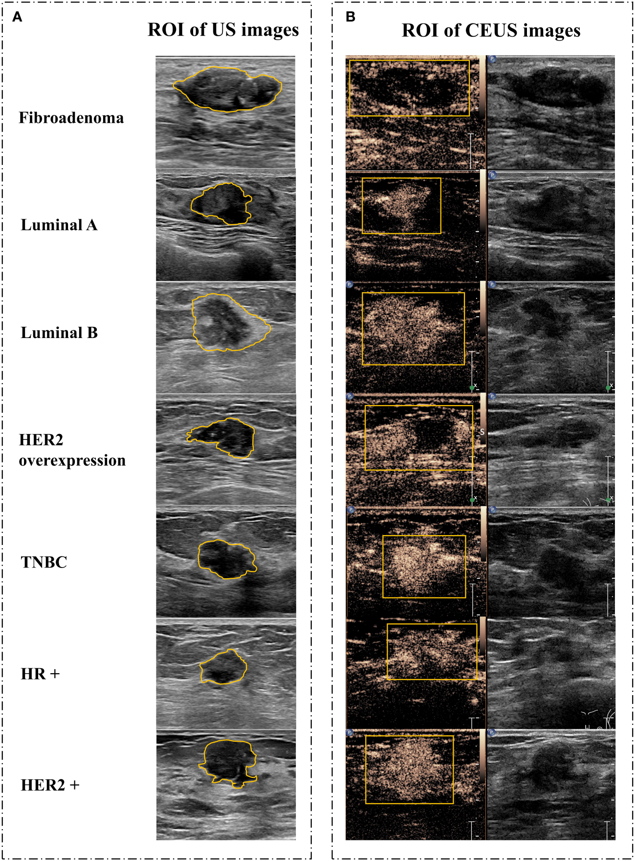 Image segmentation. (A) Schematic diagram of CUS images. (B) Schematic diagram of corresponding CEUS images with the peak intensity. CUS, conventional ultrasound; CEUS, contrast-enhanced ultrasound; ROI, region of interest; HER2, human epidermal growth factor receptor 2; TNBC, triple-negative breast cancer; HR, hormone receptor.