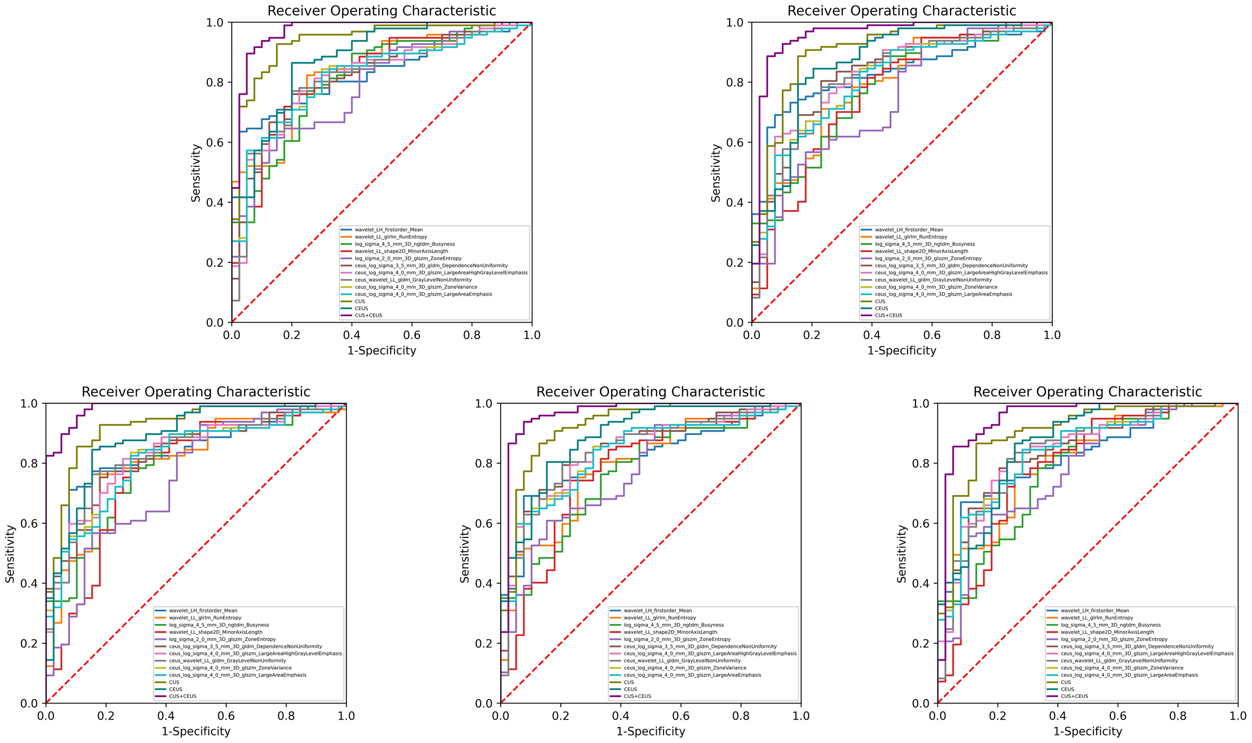 Shape features, first-order statistical features, and texture features were extracted using the pyradiomics toolkit (https://github.com/Radiomics/pyradiomics) from original images and 14 transformed images, respectively. The transformed images were generated by performing 2D discrete wavelet decomposition and reconstruction or filtering by the Laplacian of Gaussian method with different sigma parameters. Shape features of CEUS images were removed during feature selection because the usage of the rectangular box could not delineate the ROI with correct shape information. For multiple images of each lesion, the maximum value of the feature was taken as the final characteristic value.