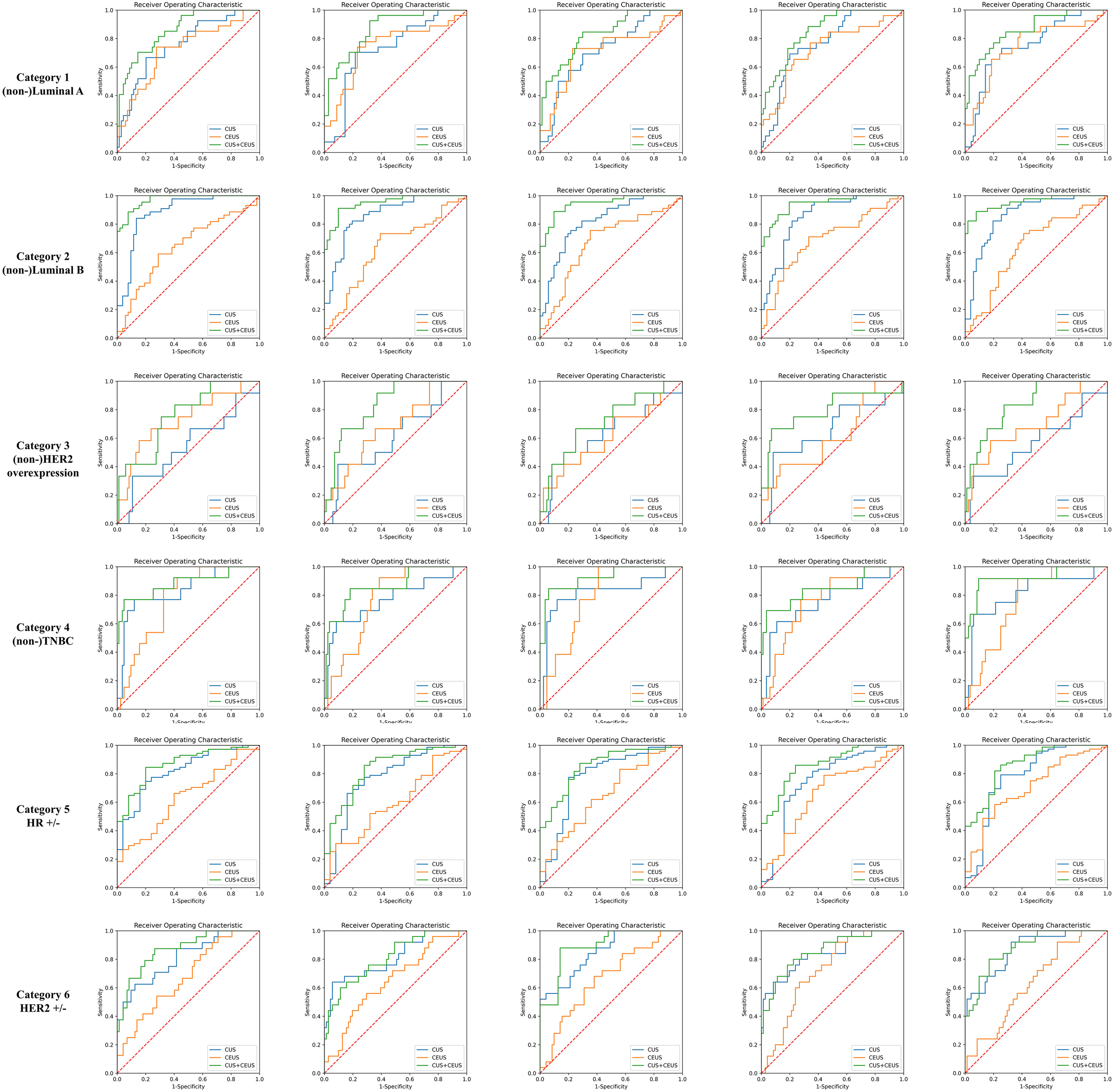 A total of 170 lesions (121 malignant, 49 benign) were selected from March 2019 to January 2022. Malignant lesions were further divided into six categories of molecular subtype: (non-)Luminal A, (non-)Luminal B, (non-)human epidermal growth factor receptor 2 (HER2) overexpression, (non-)triple-negative breast cancer (TNBC), hormone receptor (HR) positivity/negativity, and HER2 positivity/negativity. Participants were examined using CUS and CEUS before surgery. Regions of interest images were manually segmented. The pyradiomics toolkit and the maximum relevance minimum redundancy algorithm were utilized to extract and select features, multivariate logistic regression models of CUS, CEUS, and CUS combined with CEUS radiomics were then constructed and evaluated by fivefold cross-validation.