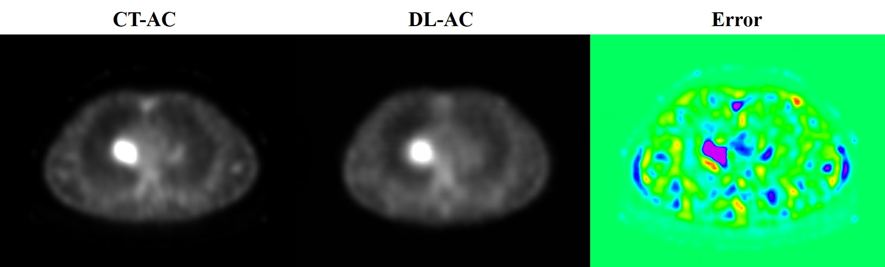 The error image between CT-AC and DL-AC in the SPECT axial image of another patient. The green color indicates that the error is 0, and the red color indicates that the error is maximum.