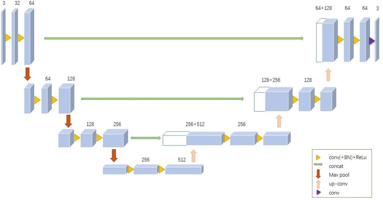 After each convolution operation in the network encoder part, the number of output channels is successively (16, 32, 64, 128, 256), and the stride is 2.