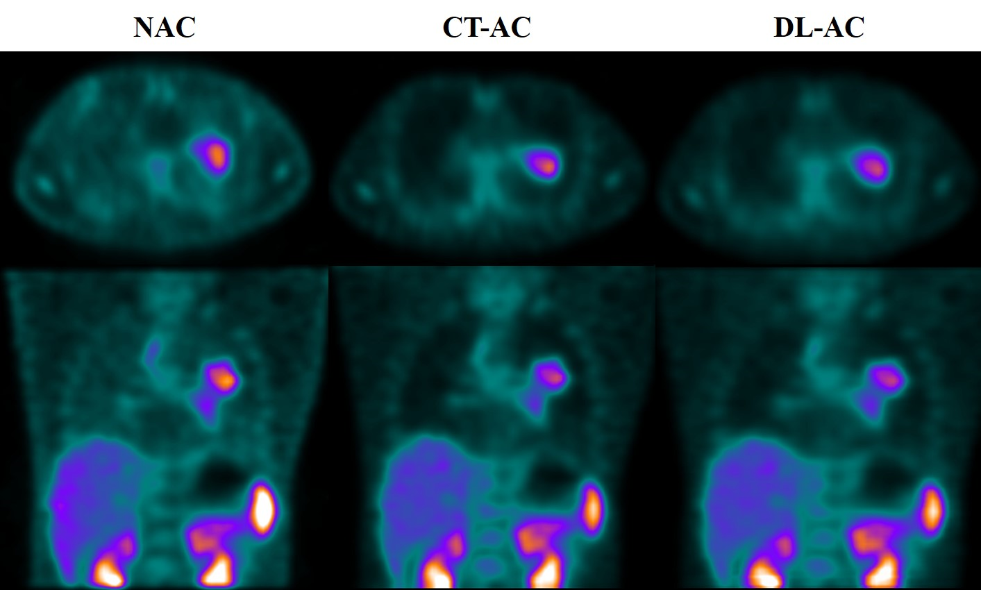 99mTc-3PRGD2 chest SPECT images of the same patient based on NAC, CT-AC, and DL-AC. The top row are SPECT axial images (NAC, CT-AC, and DL-AC), and the bottom row are SPECT coronal images (NAC, CT-AC, and DL-AC). It can be seen that DL-AC significantly improves the contrast of the chest image, and the corrected image is close to the CT-AC image. On the axial image, the maximum diameter of the patient’s lung lesion was 49.98 mm, and the maximum T/B of the lesion on NAC, CT-AC, and DL-AC were 2.91, 3.80, and 3.78, respectively.