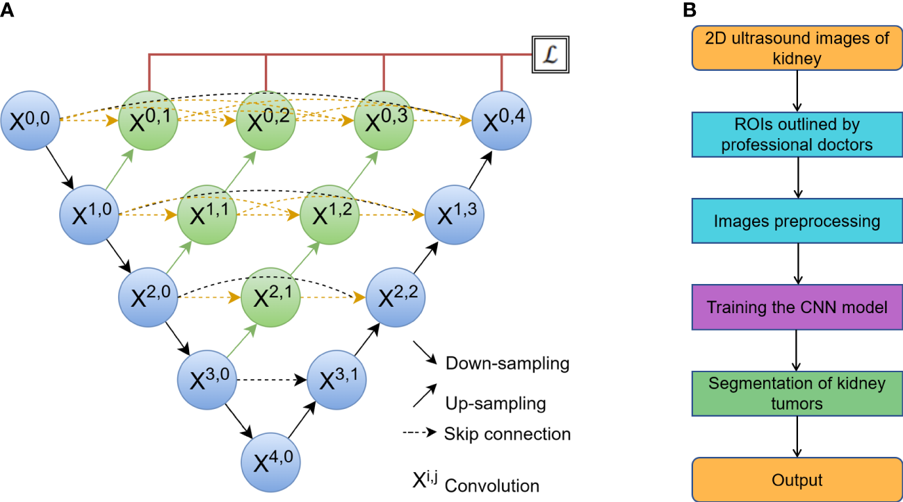(A) The network of a classic U-Net model, where Xi,j is the convolution block. The input of each Xi,j is concatenated from the up-sampling of Xi+1,j-1 from the earlier convolution layer of the same dense block and all of Xi,k (k< j) from the same pyramid level. (B) The process of automatic segmentation by the algorithm.